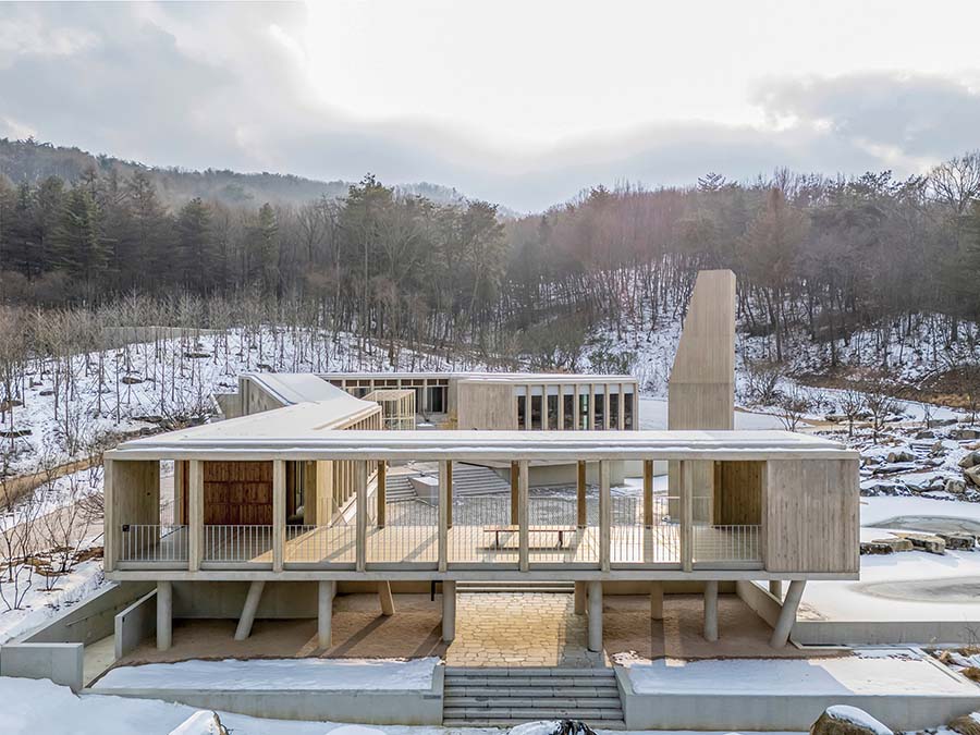 Seung H-Sang: The client asked me to design a bird nest. I studied the birds in that area. Many species fly at different heights – some like eagles, some near the ground, some on the water. I wanted to gather all those birds into one structure. At the same time, I thought it could be a vertical monastery. So the first level is a chapel, the next one is a library, then a dining room, a sleeping room, and so on. In my mind, it became a kind of small monastery for birds. The owner provides food there, so many birds come.