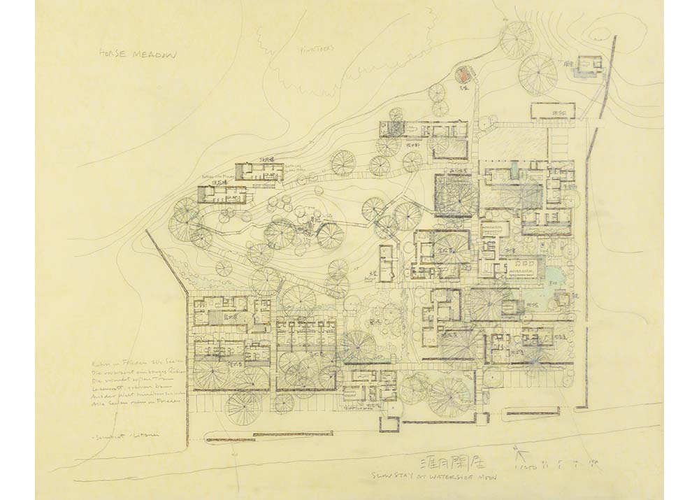 A client asked me to design accommodation there. On the site there are 45 pine trees, most of them two or three hundred years old, and very dense. I felt that the pine trees were the true owners of the land, so none of them could be harmed. I promised each pine tree that I would take care of it. I gave a territory to every tree, and in order to protect those territories, I surrounded some of them with buildings, fences or walls. The trees and the land told me what kind of architecture they wanted. I listened to what they said.
