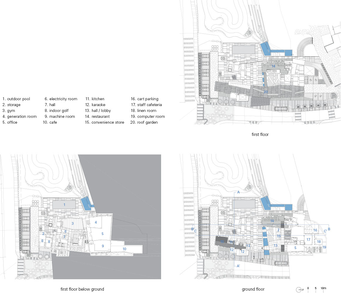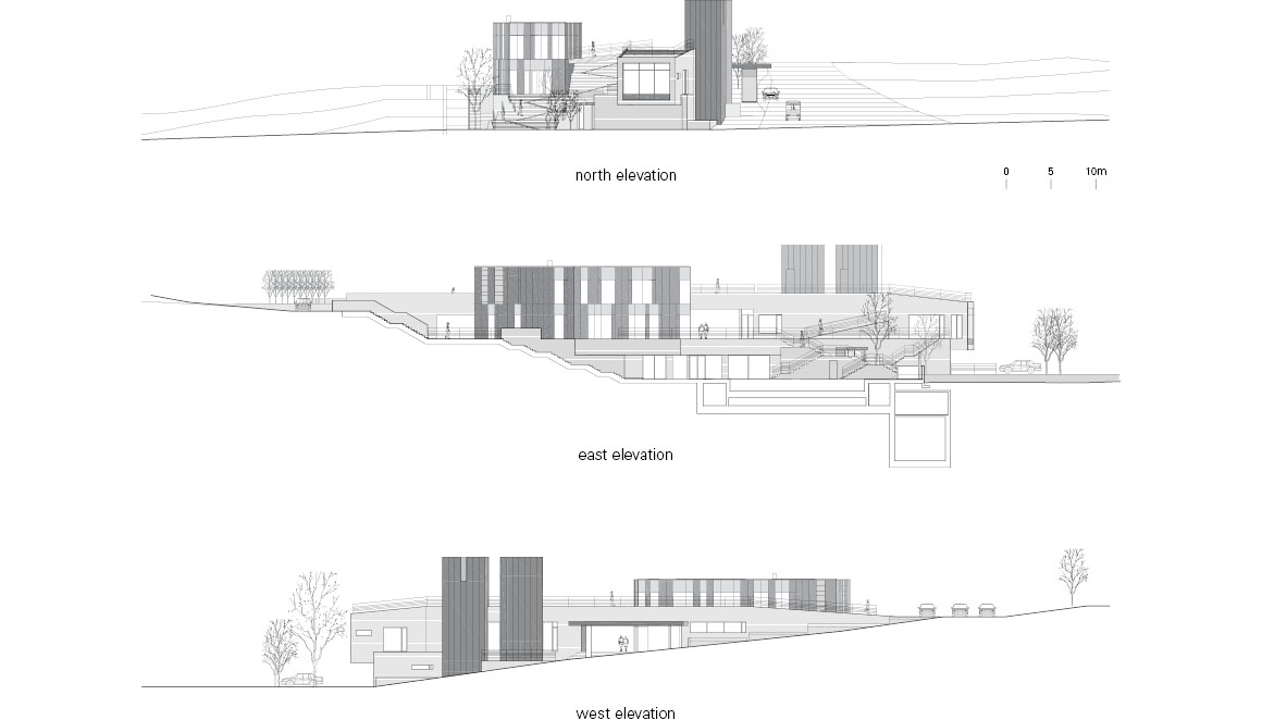 The clubhouse located at the entrance of the complex maintained the theme of the scenery. The clubhouse sits upon varying levels of ground extending in all directions. These different levels are organically connected via the architecture. In one area, the ground serves as a roof terrace for the clubhouse. Following up the inclined entrance leads to other grounds; the path continues on to the cafeteria, the yard, the gallery, and the pool. In this way, the topography forms the architecture. The building has no form or symbolization. The only lasting impression is that of the landscape.