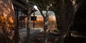 Inside, the triangular floor plan creates a unique spatial tension. This is further accentuated by the view from the café’s lower level, which opens onto an exterior deck that sits higher on the hillside. A central staircase at the rear of the building connects the indoor café to the outdoor terrace. This cave-like stairway, open to the sky, seems to rise from the earth, cutting through the landscape. Flanking the staircase is a shallow water feature, allowing visitors to walk across the surface of the water as they ascend. This creates another transparent stage, framing views of the distant mountains, fields, and streams.