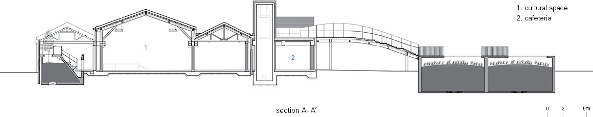 New volumes for performance and exhibition are composed of a restrained palette of steel, glass, and exposed concrete, and positioned so as not to intrude upon the existing structure. This strategy satisfies present-day requirements for structural safety and building regulations while clearly articulating the material contrast between the “old” and the “new.” Different temporal layers do not collide; they stand side by side, sustaining a quiet spatial tension.