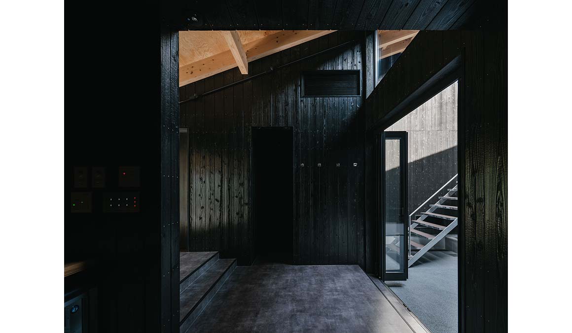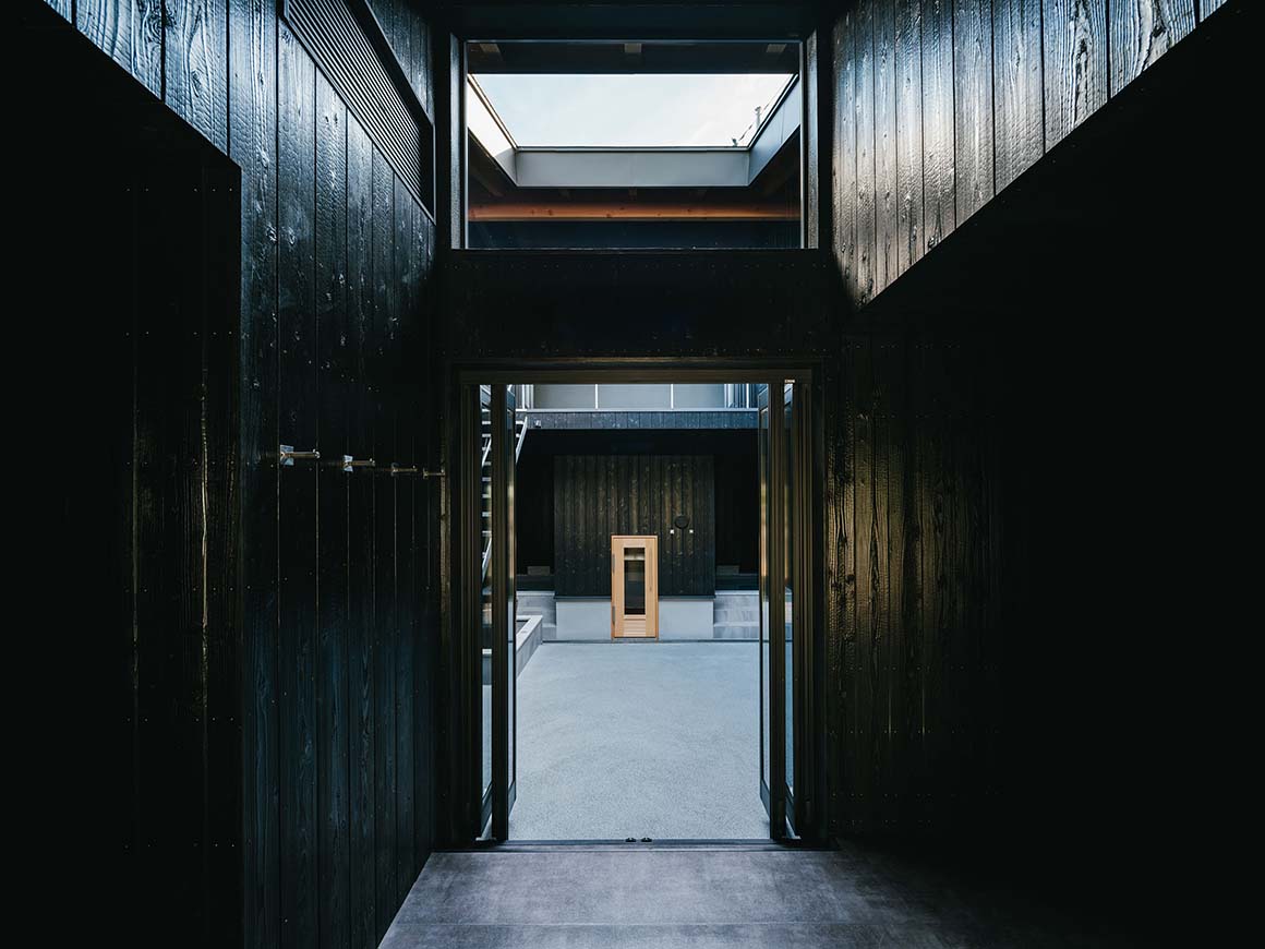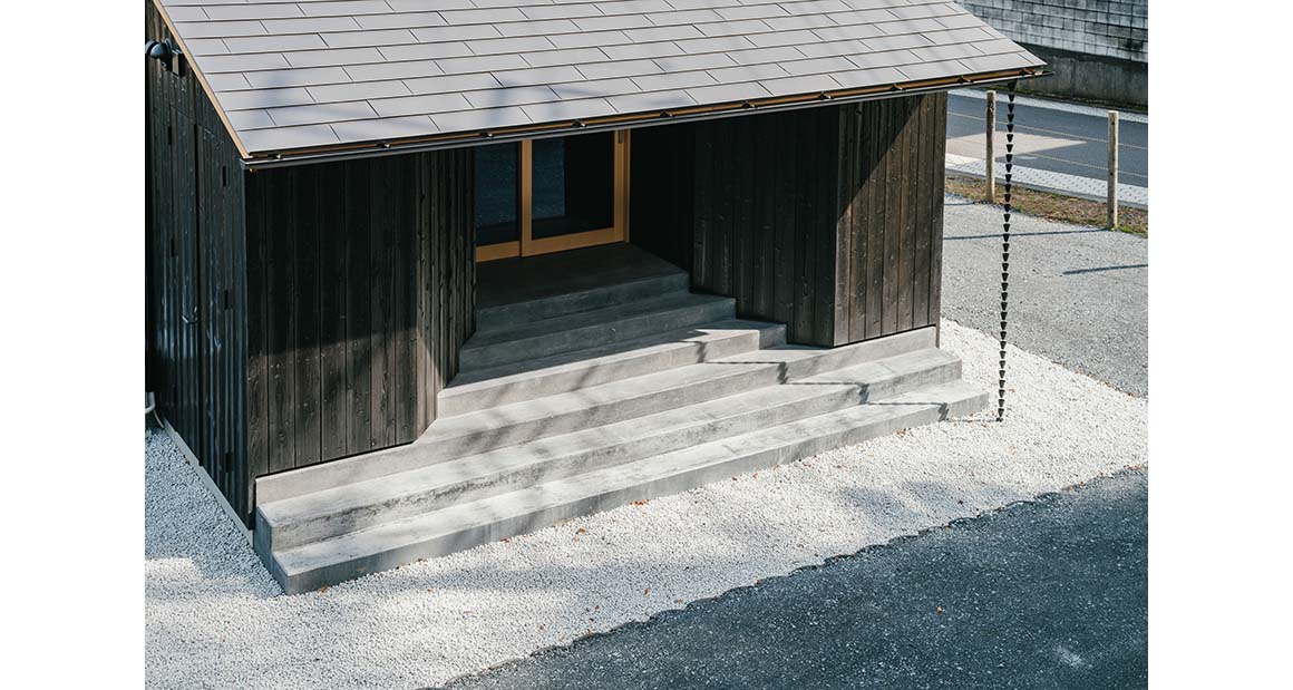 Dark-toned cedar boards treated with a charring technique reveal a deep texture. The gently sloping roof, reminiscent of a climbing kiln, follows the gradients commonly found in the region while adding a contemporary reinterpretation. Black concrete steps mediate between the charred timber façade and stone paving, emphasizing material continuity. Gravel laid around the building visualizes the boundary of the site.