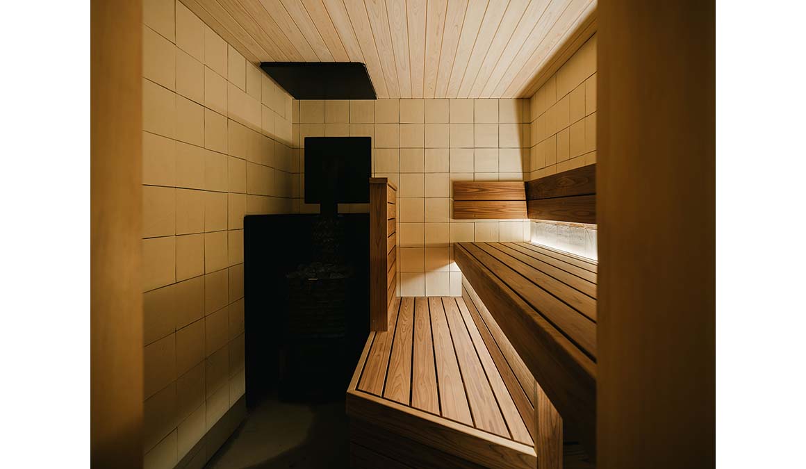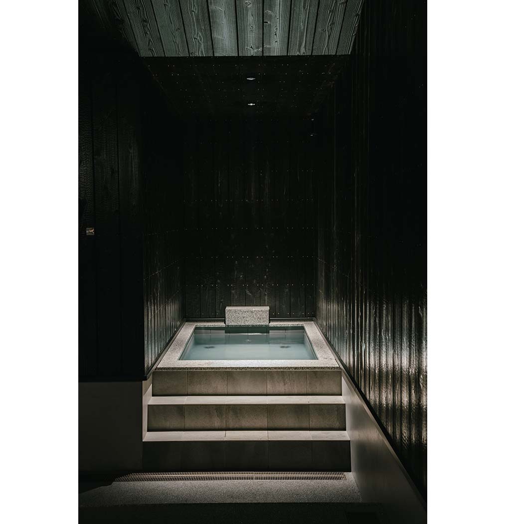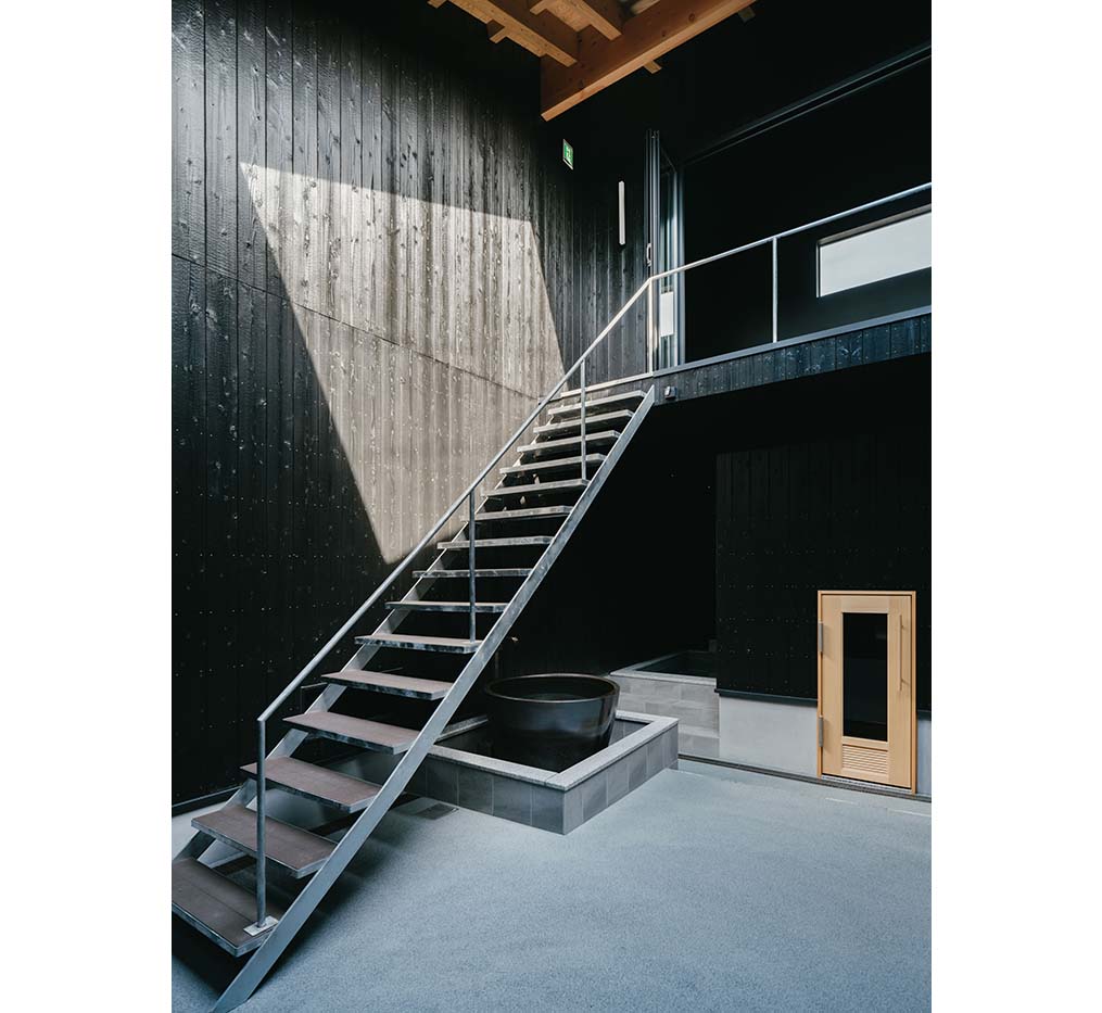 The interior is organized clearly around horizontal circulation and a vertical axis. The changing room, baths, showers, and restrooms are integrated into a single plan, arranged so that the sauna space is naturally perceived along the approach sequence. A three-meter-high atrium is introduced in the open-air bath to block views from the nearby hill while drawing in light and wind. A linear path that anticipates the transition between heating and cooling the body leads to the sauna. Centered on the sauna, cold and hot baths are arranged symmetrically, and a ceramic tub beneath the stairs uses well water to maintain a constant temperature throughout the year. Within a tranquil atmosphere that filters out the noise of the city, the flames of the wood-burning stove flicker, ripples spread across the water’s surface, and light filtering through the atrium suggests the passage of time, creating sensory scenes.