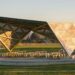 The main facade on the east is covered with a metal mesh curtain, rigid yet flexible material following the curvilinear pattern consisting of multiple semicircles. The metal mesh connecting the two mirrored patterns will create a transitional form. This skin produces a layer of diffusion in front of the solid wall, which needs to completely separate the interior space from outside. It suggests an ambiguous characteristic of the façade, which is diversified by the colorful LED lights installed at the bottom of the façade, emphasizing its curvilinear form during the night time.