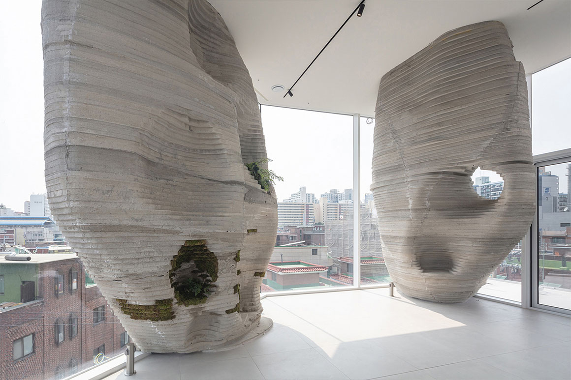 Loston integrates massive rocks as part of its architectural structure. Reinterpreting Seoul’s dominant environmental feature—the mountains—this building fills the void of lacking public spaces and a connection to nature, offering an open space for relaxation and cultural activities.