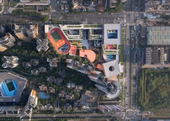 Rather than emphasizing the building’s solidness, the building’s surface materials contain graphical features. The winding lines on the façade are taken from the skylines of Namcha Barwa. This Himalayan mountain falls into the bustling urban center, reflecting the noisy and earthly scenes of the human world, its sparkling features lending a romantic touch to the sparsely adorned building.