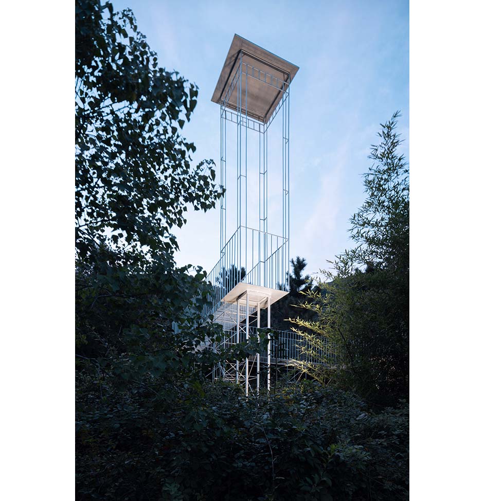 The architect collaborated with artisans on-site, allowing the design to evolve organically during the construction process. Over the span of half a year, from spring to autumn, the garden was completed. The steel structures were assembled in modular units, extending seamlessly through the forest. The spacing between the steel rods ensures an unobstructed view, allowing grass and trees to grow freely through and beyond the structure. Visitors immerse themselves in this setting, relishing the tranquility and leisure it offers.