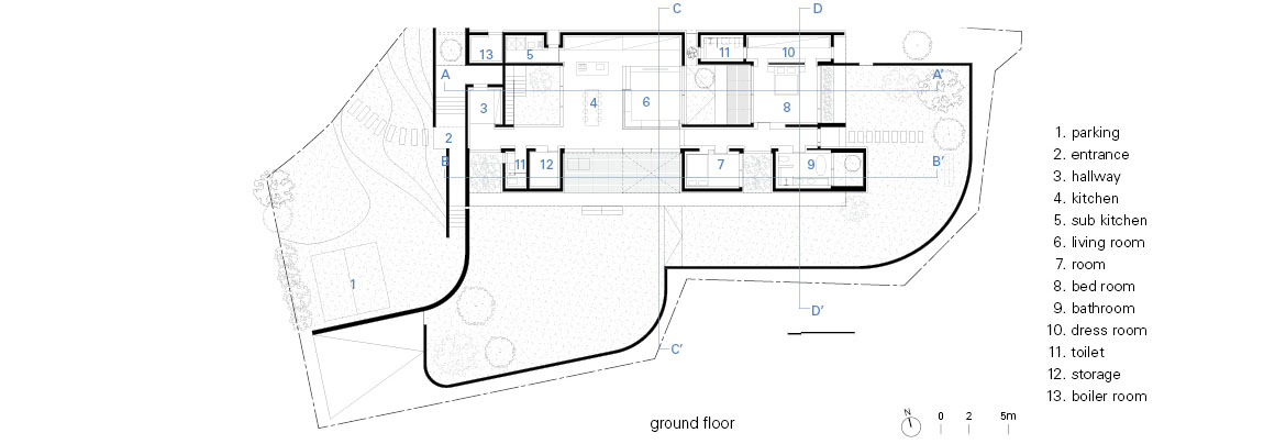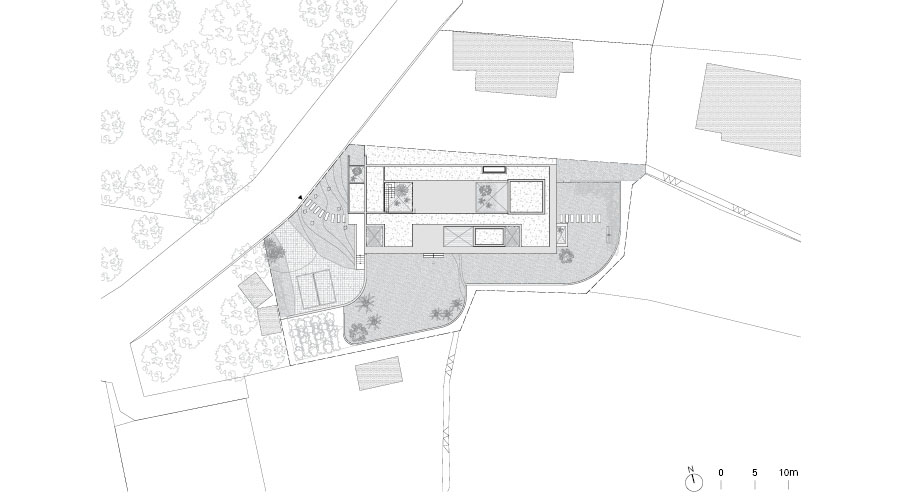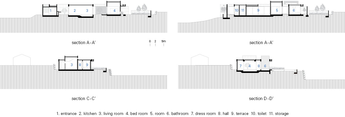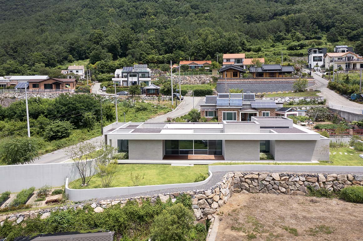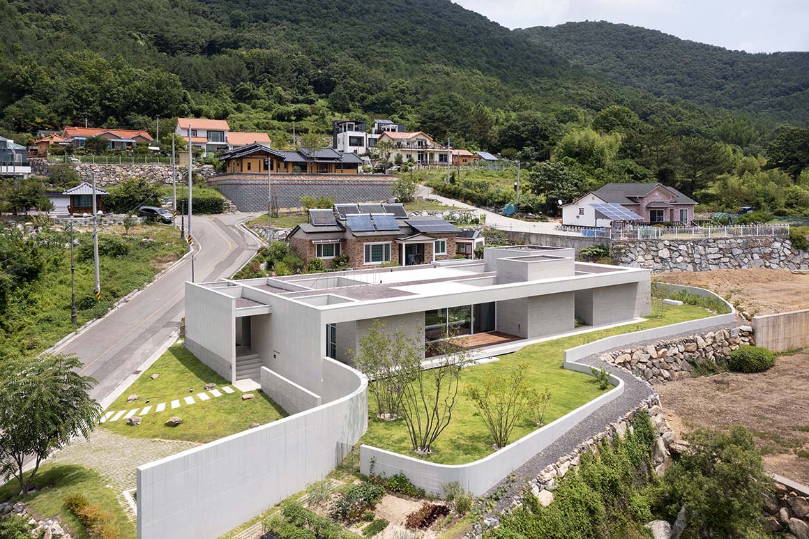 The house is located amid a small village on a slope that flows down the mountain and on the border between the residential development area and this village, which is made by clustering the slopes in a stepwise manner. The site is a combination of two parcels left in an unnatural shape with a difference in height, and the house sits on the wide ground. It is not a house where daily life takes place, but a place where you can take a rest as if you were on a trip. As a weekend country house it offers a life that is difficult to dream of in an apartment in the city center, such as a mountain view, sunlight in the living room all day, a courtyard and garden where you can walk barefoot, and a vegetable garden, a dream of city dwellers. As a result, I can sit anywhere while walking around the house with a longer breath than the efficiency and functional system of a general residential space. It depicts the landscape modestly and shows the results of contemplating how to encounter it without harming the light and view of the neighboring houses.