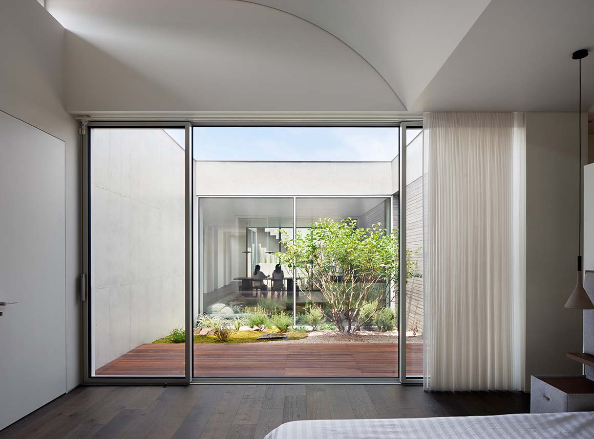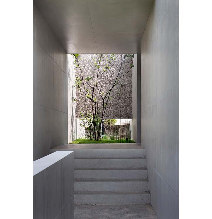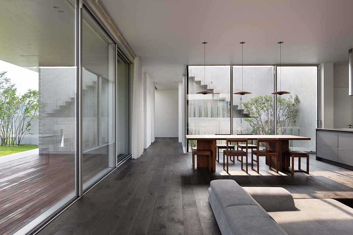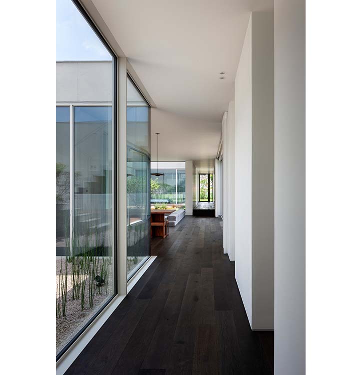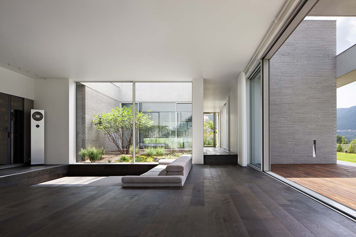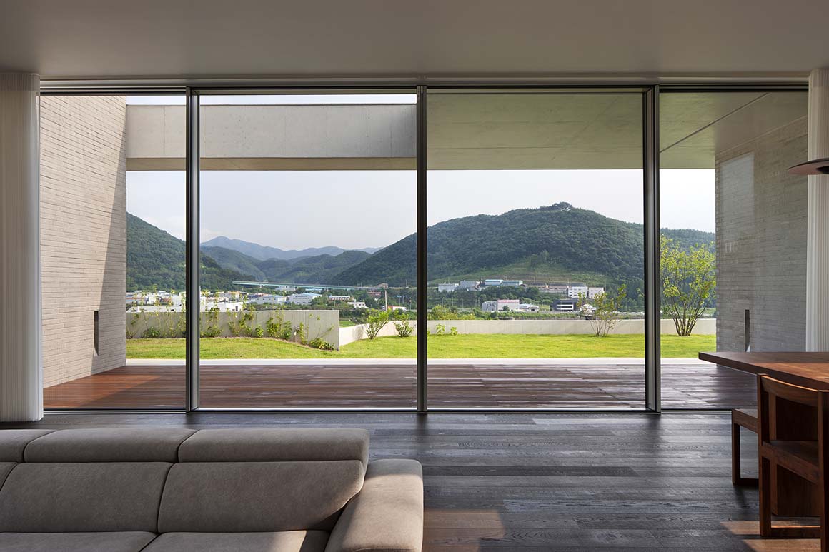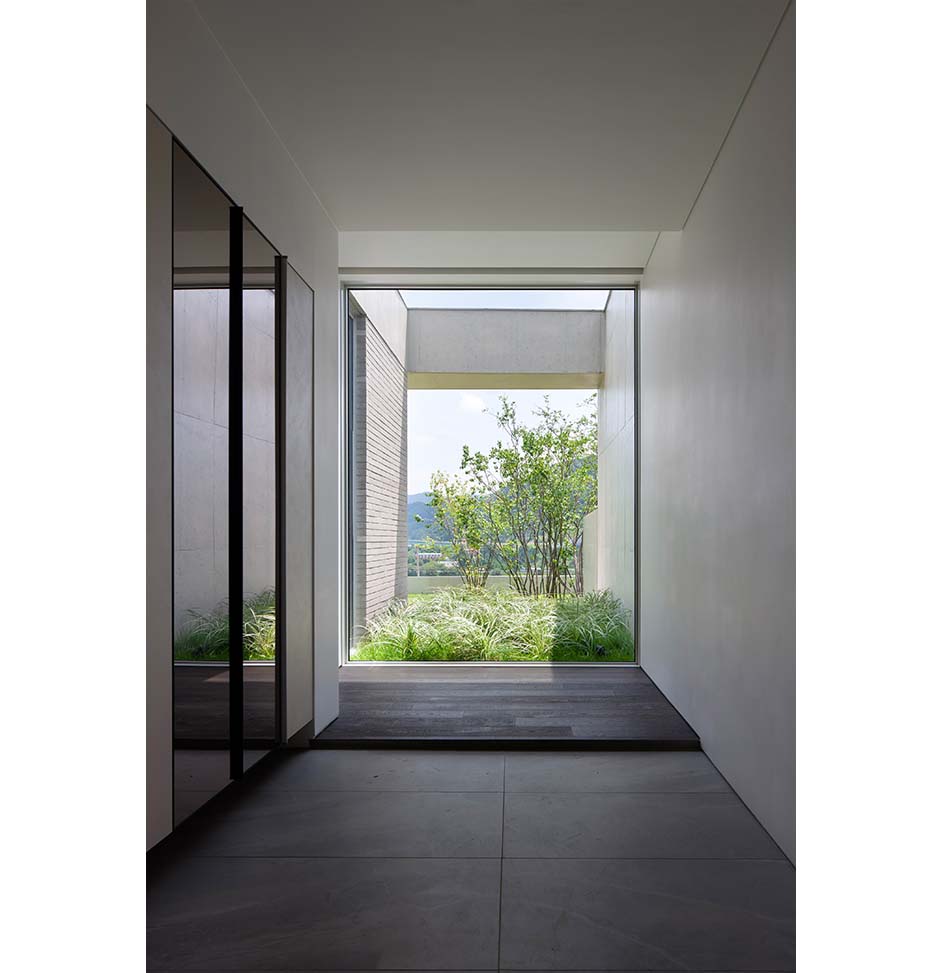 The outside light and shadow are connected with the inside shade, and new boundary is created. The boundary is naturally released with light, wind, and sounds of nature that naturally cross the inside and outside. In the three courtyards arranged around the living room and the long corridor in front of the living room, the area of the cleared boundary is located. In this way, the courtyard-living room-corridor is integrated into one area. The connection between domains expands the space and feels like it spreads out to the outside, approaching the distant mountain scenery, pulling the scenery into the courtyard, and bringing it back into the living room.