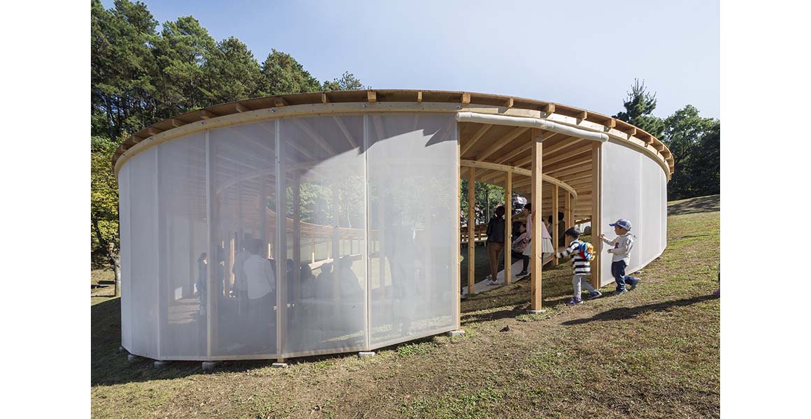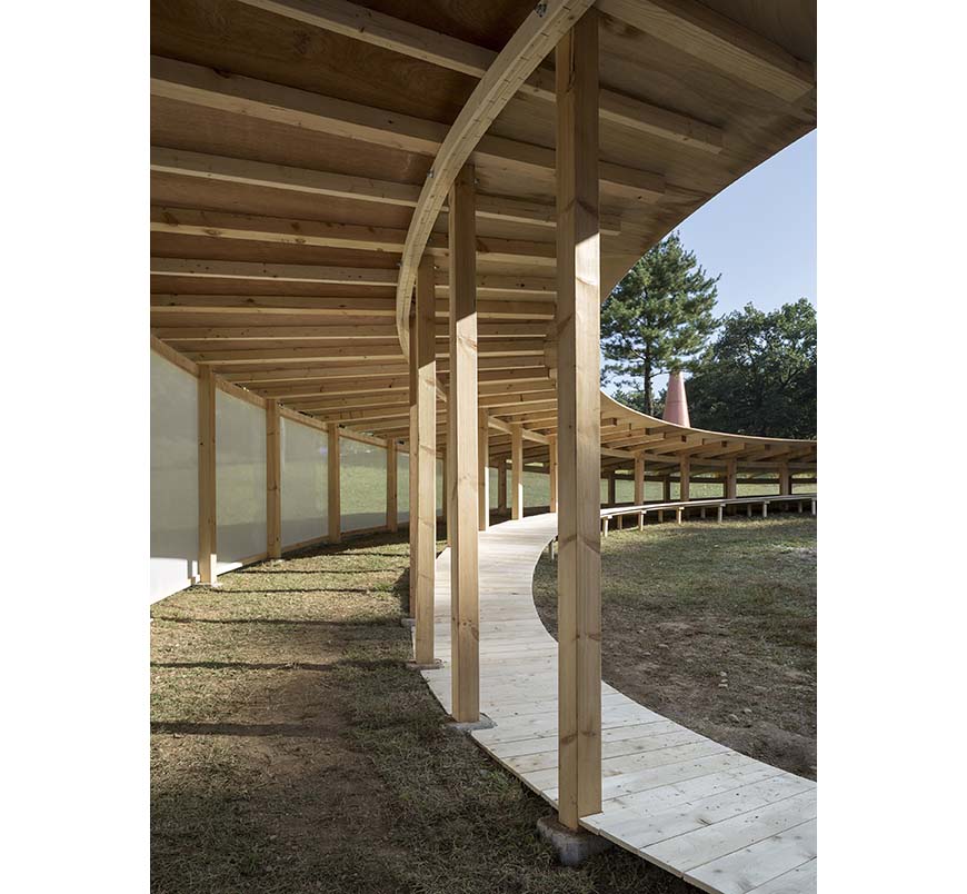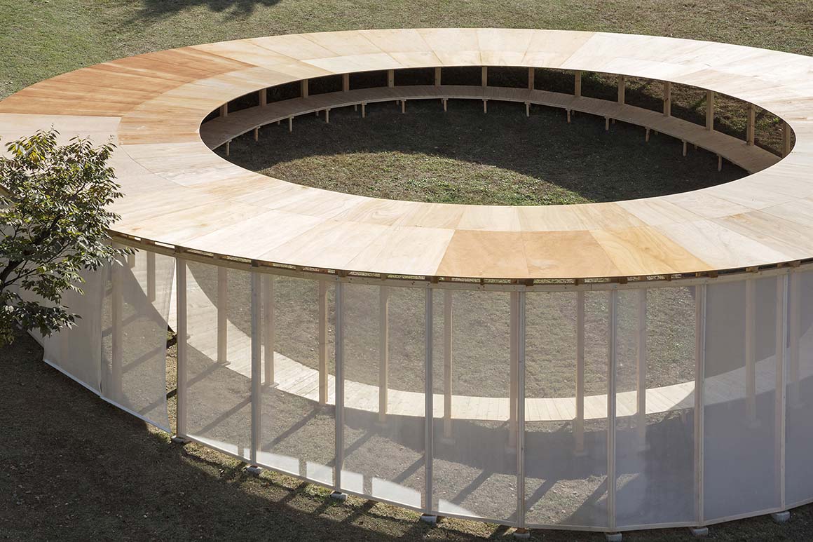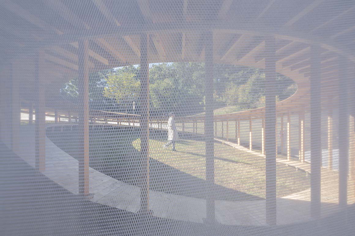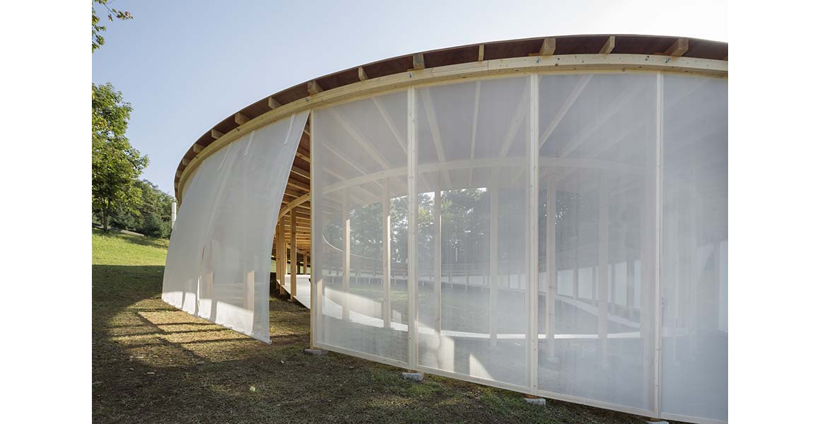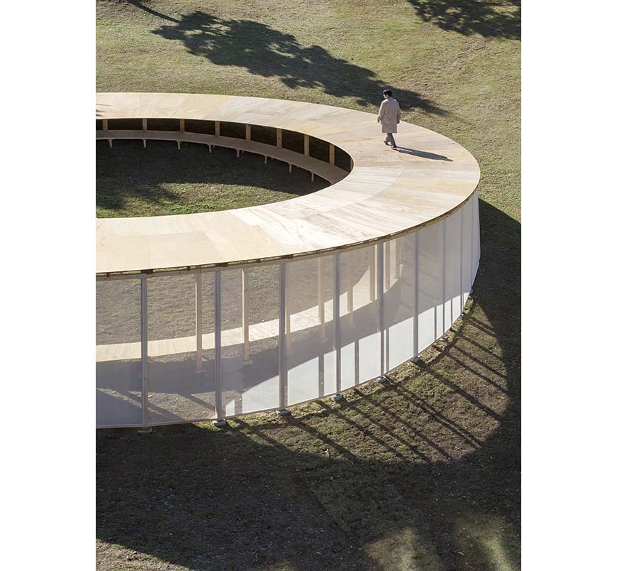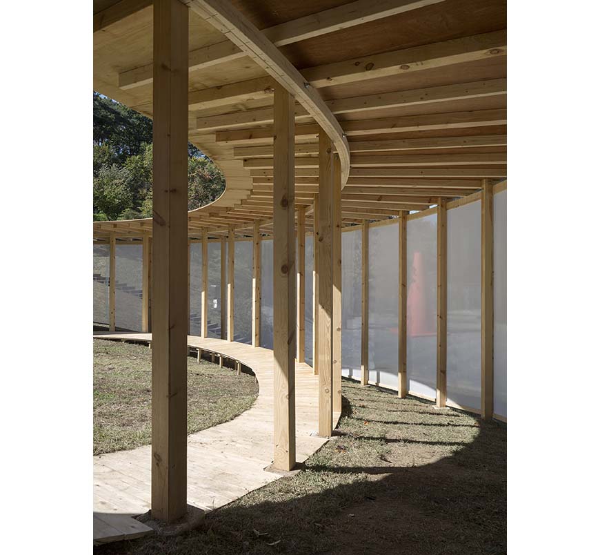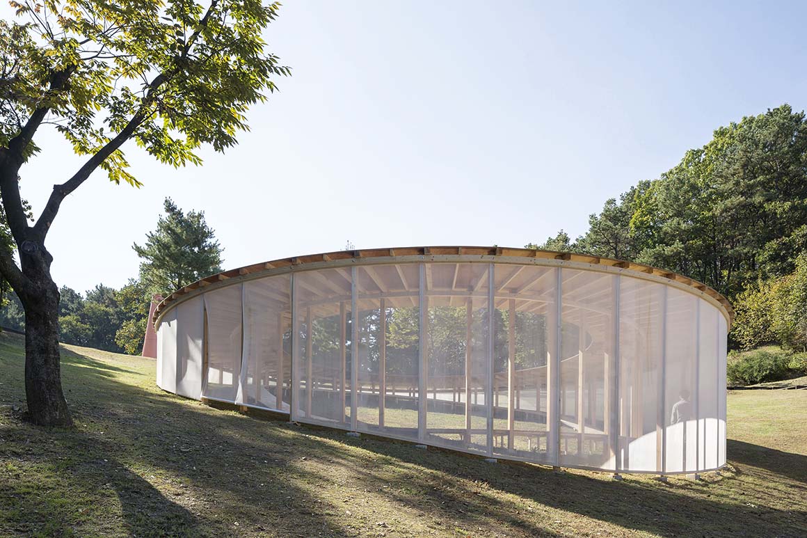 The pavilion sits outdoors, but a circular white screen surrounds the structure like a wall, creating a boundary even as it remains open. The screen is half-transparent—closed and open at the same time. Movements inside the space can be seen from outside, while the landscape outside can still reach the inside. It suggests a kind of display exchanging inside and outside in real time and brings to mind the work of Nam June Paik. Through the open circle at the top of the roof, light, sky, and forest enter the space. Because of this, every point along the round wooden bench beneath the roof connects to bright and green shades of nature.