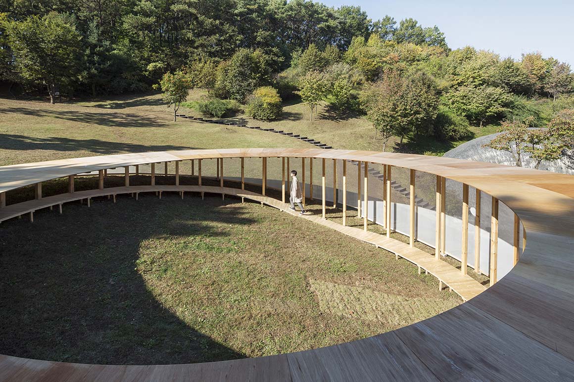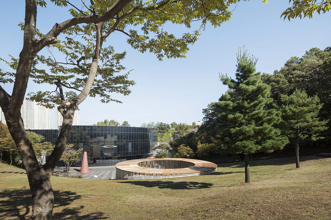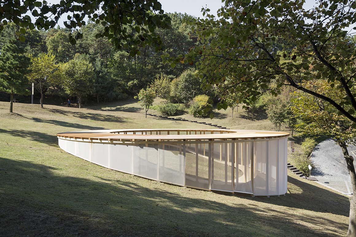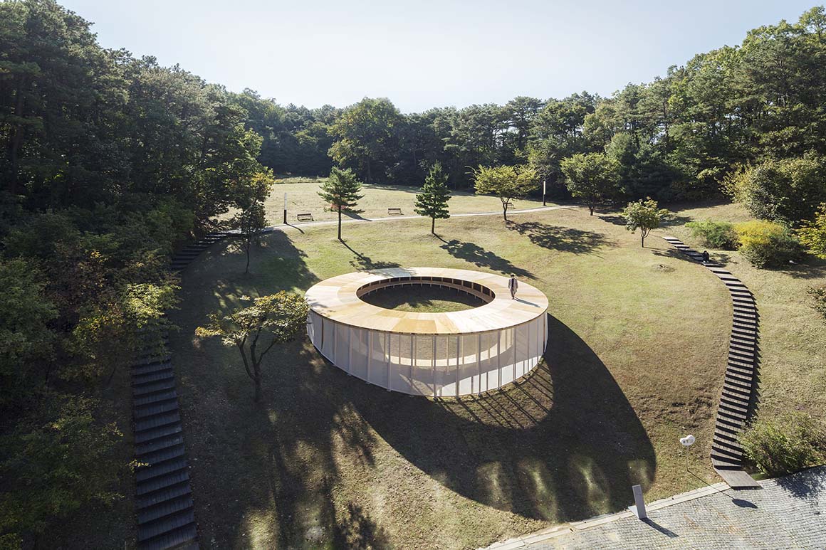 This pavilion stands inside the Nam June Paik Art Center in Yongin, Gyeonggi-do, South Korea. It functions as an outdoor space for small concerts and music events. The structure takes the shape of a circle placed on top of a sloped courtyard, surrounded by forest. The round roof covers the ground in a flat, horizontal line, regardless of how the slope rises or falls. Where the roof nearly touches the ground, visitors can sit on it like a tree stump, climb onto it, or even walk across it. In areas where the slope is steep, the roof rises high, forming a deep interior space. The part of the roof that touches the ground becomes the stage. Meanwhile, the deeper space created by the sloped area becomes the audience seating, arranged so viewers can look up through the open center and watch the higher stage.