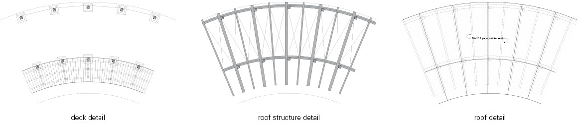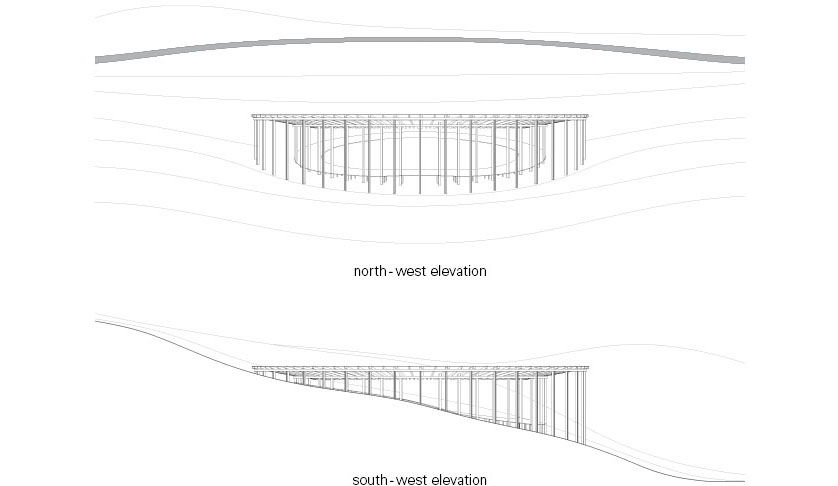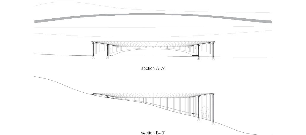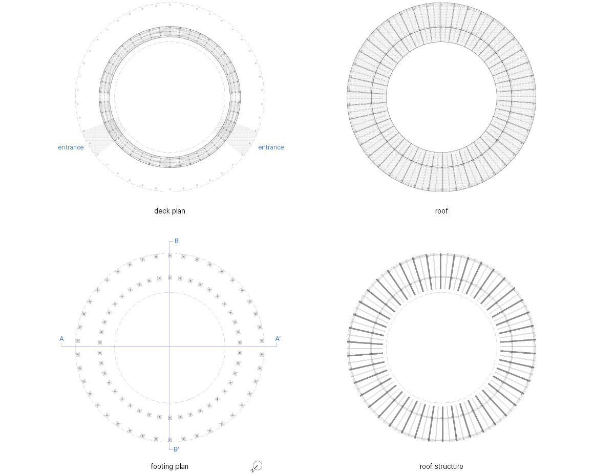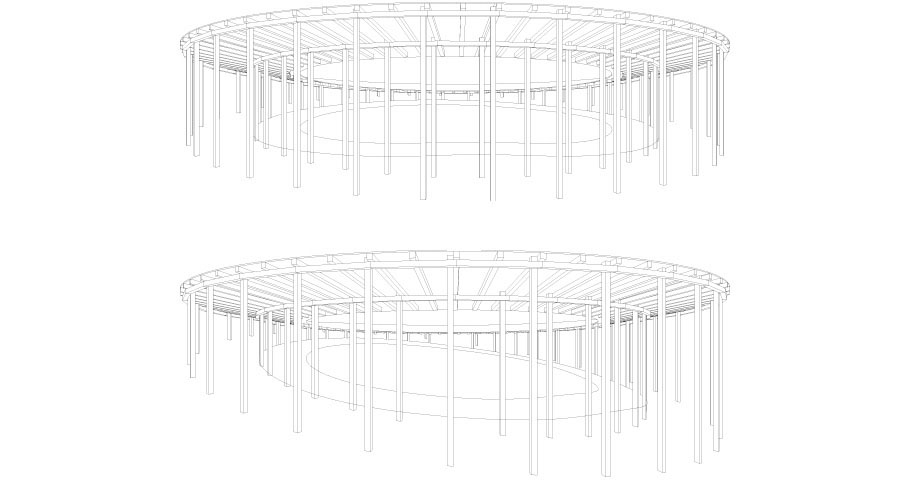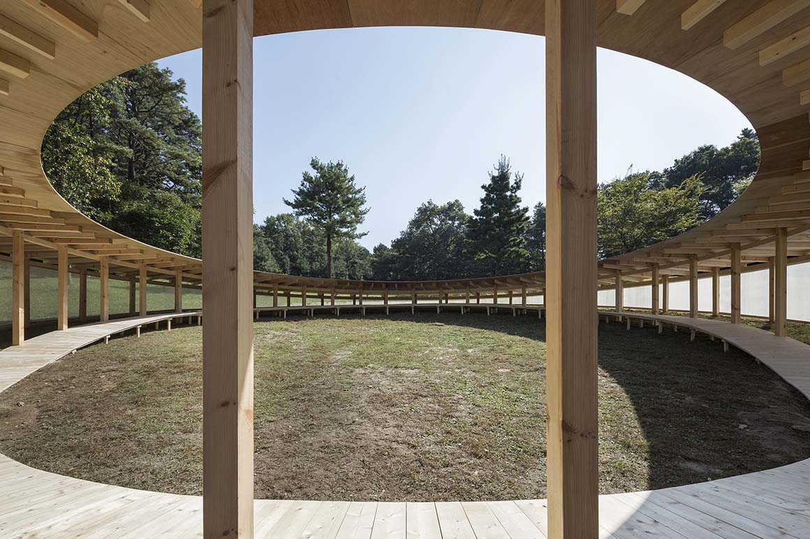 This pavilion stands inside the Nam June Paik Art Center in Yongin, Gyeonggi-do, South Korea. It functions as an outdoor space for small concerts and music events. The structure takes the shape of a circle placed on top of a sloped courtyard, surrounded by forest. The round roof covers the ground in a flat, horizontal line, regardless of how the slope rises or falls. Where the roof nearly touches the ground, visitors can sit on it like a tree stump, climb onto it, or even walk across it. In areas where the slope is steep, the roof rises high, forming a deep interior space. The part of the roof that touches the ground becomes the stage. Meanwhile, the deeper space created by the sloped area becomes the audience seating, arranged so viewers can look up through the open center and watch the higher stage.