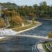 The interior, clad in the same black wood as the exterior, blurs the distinction between inside and outside. This neutral frame focuses attention on the material and emphasizes its relationship with another external element—sunlight. Meanwhile, the exterior features open areas not covered by wood, with X-shaped structures from the lower level hinting at the unobstructed area of the façade and encircling the house’s perimeter.