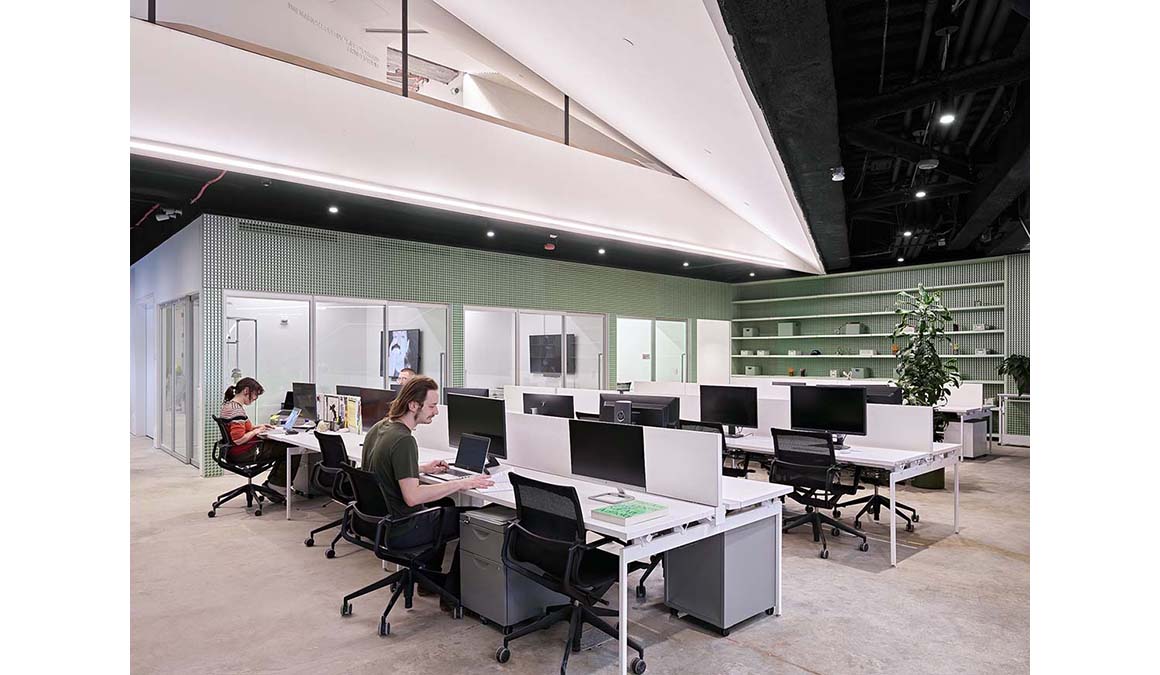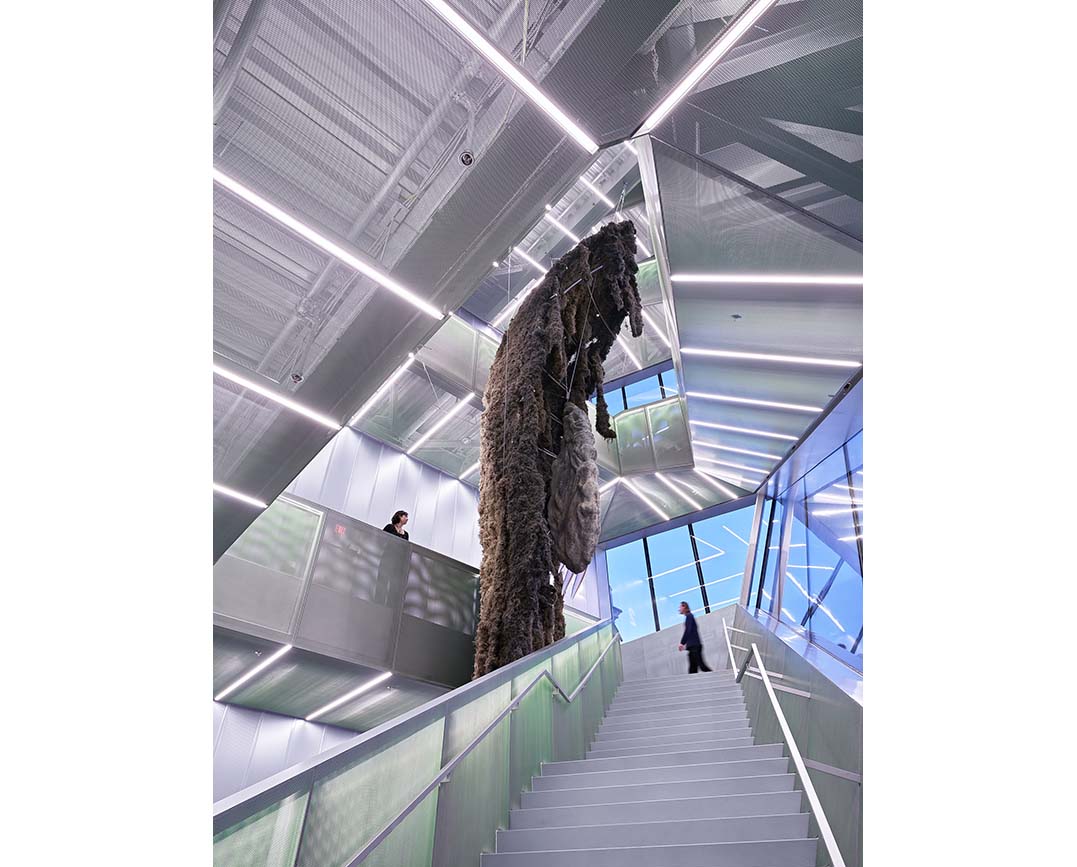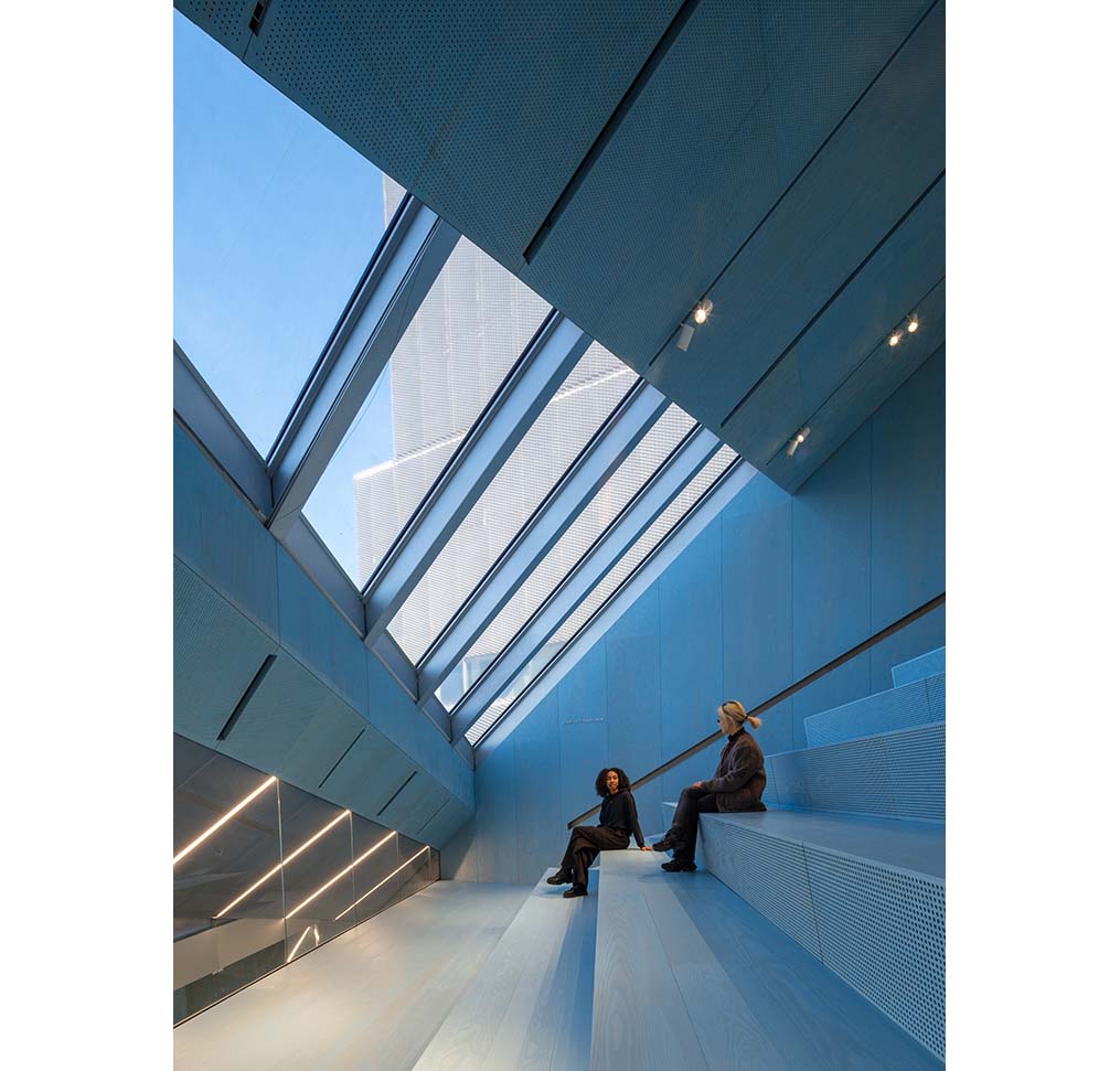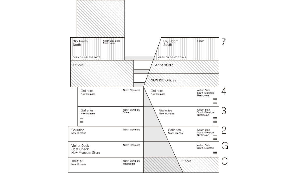 The facade reveals circulation routes and slices of activity within, visually connecting the interior to the street. An outdoor plaza at the intersection encourages entry and gathering, establishing the museum as an extroverted institution that actively engages with the city. The expanded building doubles the gallery space while introducing more fluid circulation through three elevators, an atrium stair, and an entrance plaza. It also includes spaces for public programs and events, such as the seventh-floor Sky Room and a 74-seat forum. Upper levels accommodate artist-in-residence studios and the museum’s cultural incubator NEW INC, while the ground floor features an expanded lobby, bookstore, and restaurant.