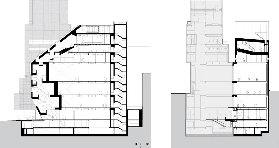 As the new building rises, its gallery spaces increase in size, while those in the existing building decrease, maintaining a balance in total floor area at each level. Between the two, an intermediate zone containing an atrium stair and elevators improves vertical circulation while mediating between the museum and the city. This sequence of spaces—from the outdoor plaza through the atrium to the upper terraces—links public activity with the interior.