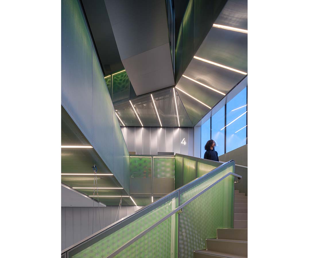 The building steps back diagonally from the top of the gallery stack toward the street, creating a plaza that serves as a buffer between the new and existing structures and provides an open threshold from the city. At the upper levels, additional setbacks pull the mass back to open terraces toward the sky. The facade, clad in laminated glass with a layer of metal mesh, appears as a unified volume during the day, while at night it becomes more transparent, allowing interior light to reveal the structure and activity within.