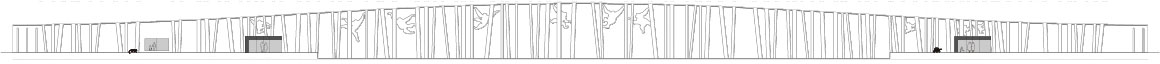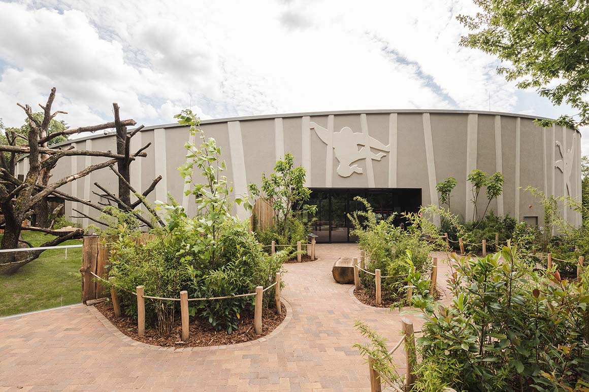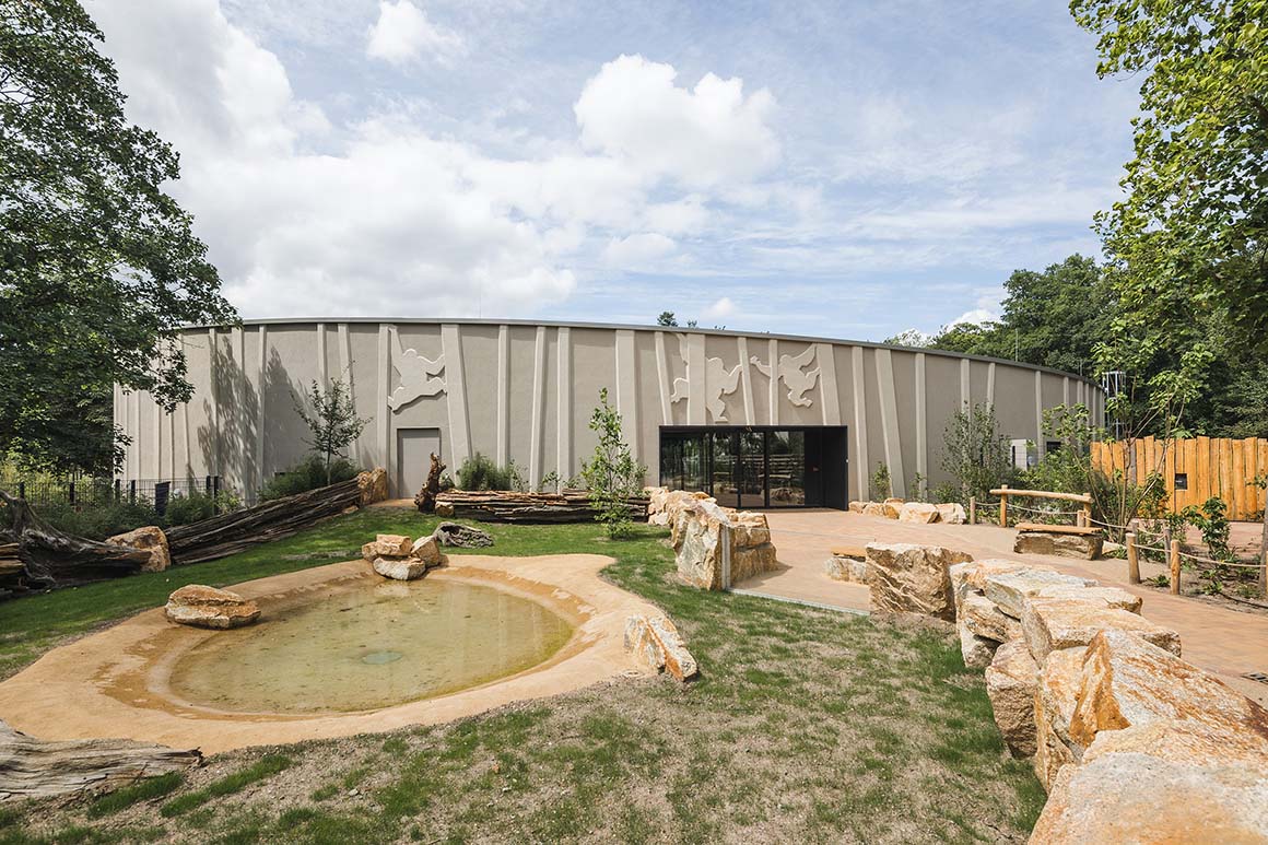The facade consists of a beige and brown plastered surface articulated with relief elements up to 6cm in depth. Vertical elements abstracted from tree trunks are arranged at varying angles, revealing silhouettes of orangutans in between. This operates not merely as decoration but as a facade language that communicates the building’s program and sense of place. The gently sloping, cone-like mass lowers toward the ground, establishing continuity with the surrounding park landscape.