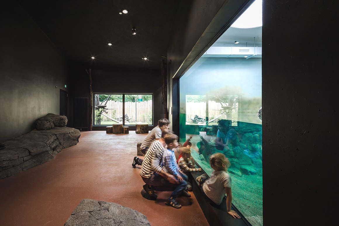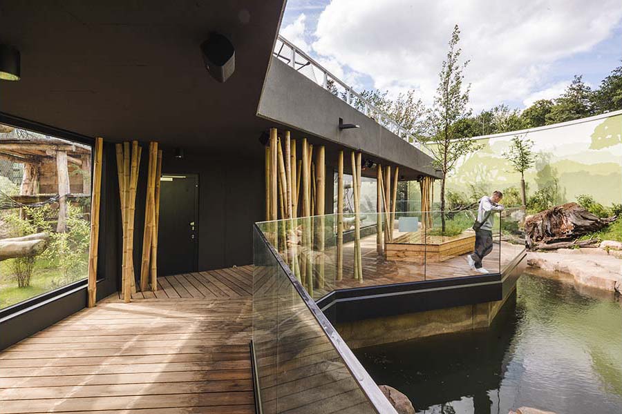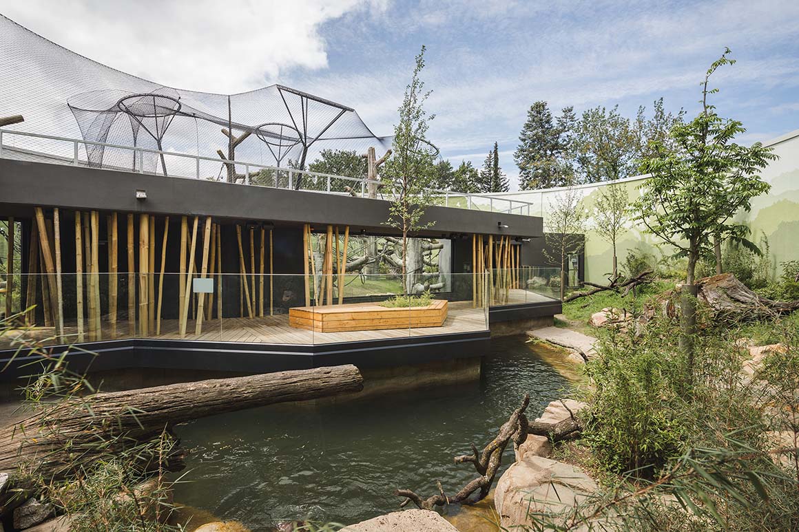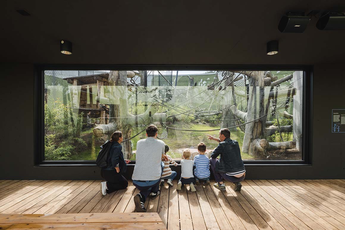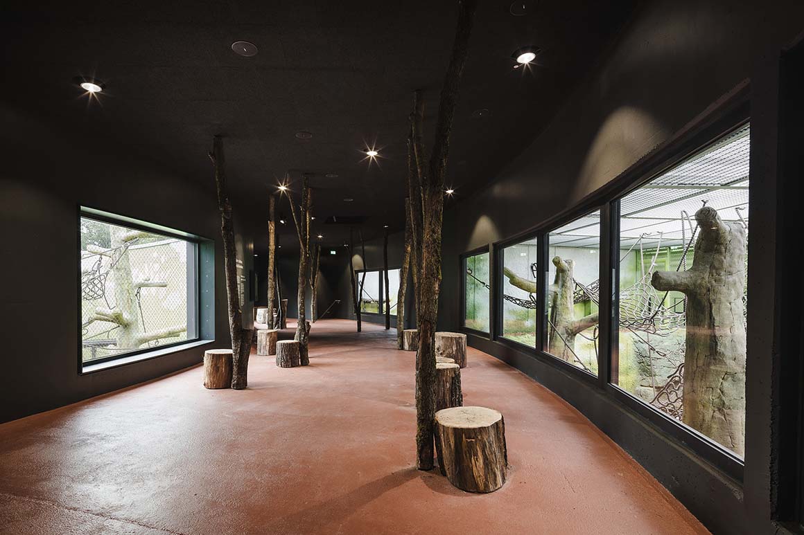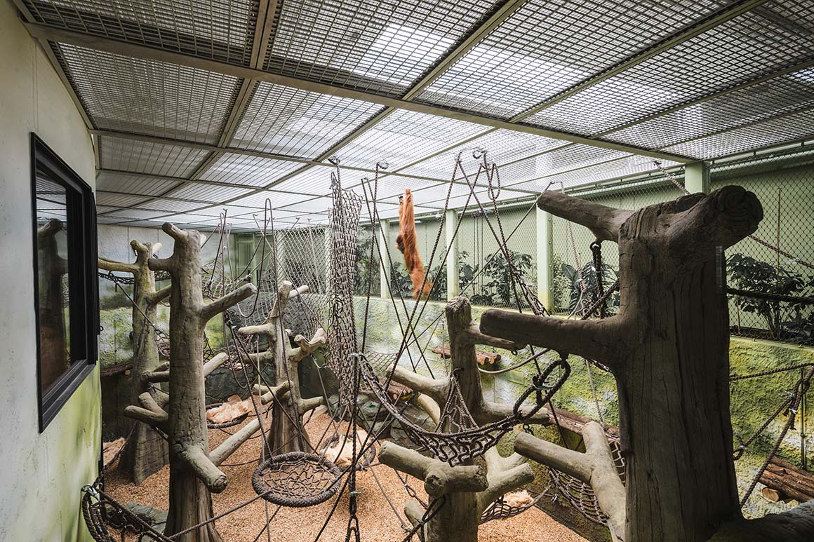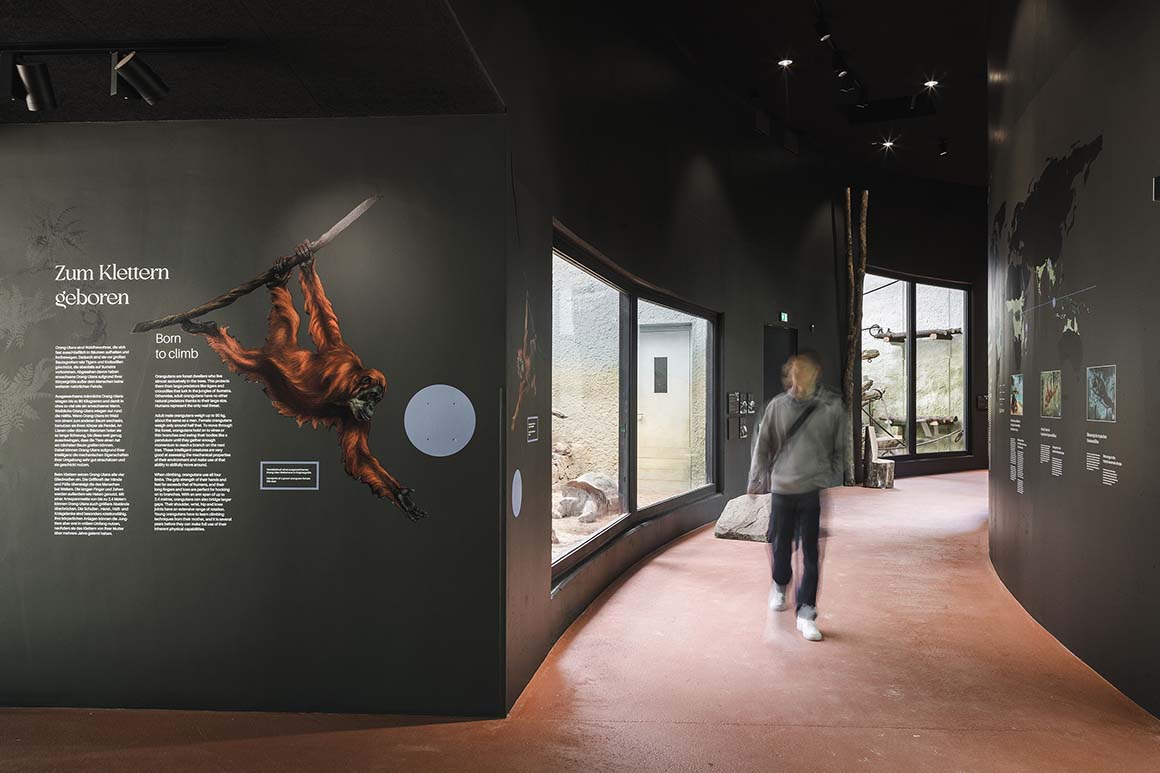 Project: Dresden Zoo New Orangutan House / Location: Tiergartenstraße 1, 01219 Dresden, Germany / Architects: heinlewischer / Project team: Jens Krauße (partner in charge), Steffen Thombansen (project manager), Sophia Hering, Norbert Mayer, Christoph Meinhardt, Rico Moschke, Joana Ragazinskaite, Claudia Tümmler / Structural engineer: HJW + Partner / Landscape architect: Rehwaldt Landschaftsarchitekten / Building services engineering: ILK – Institute for Air Handling and Refrigeration Technology / Exhibition design: molitor / Illustration: Falk Nordmann / Client: Zoo Dresden GmbH / Use: zoo / Bldg. area: 2,045m² / Gross floor area: 4,164m² / Gross volume: 21,173m³ / Cost: EUR 22 million / Design: 2019.8 / Construction: 2021.7-2023.12 / Completion: 2024.6 / Photograph: ©Konstantin Boerner (courtesy of the architect); courtesy of the Dresden Zoo