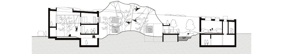 Evolving from a conventional animal enclosure, the new orangutan house functions as a spatial framework that reconfigures both the animals’ habitat and the visitor experience. Reflecting the ecological behavior of wild animals and their patterns of social interaction, the building establishes a husbandry system that accommodates the separation and regrouping of females with offspring and solitary adult males. At the same time, it recreates the habitat of the Southeast Asian tropical rainforest, expanding into a multi-species ecological exhibition in which various species coexist.