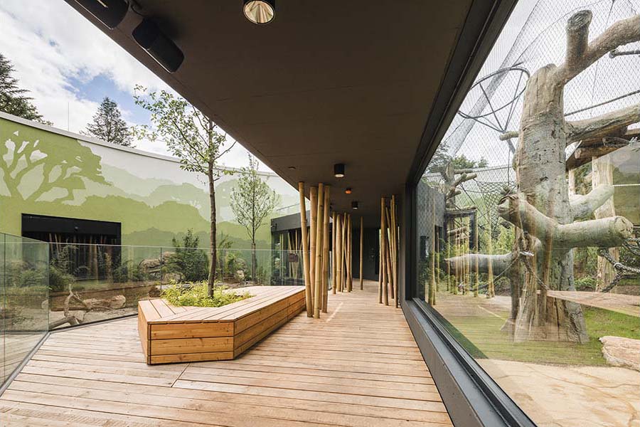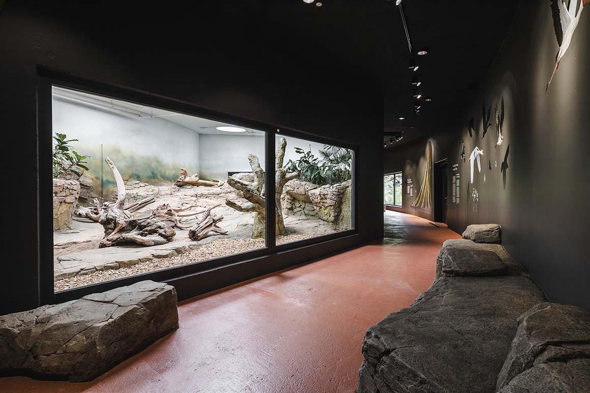 The interior is organized through the contrast and alternation of a dark “forest” and a bright “clearing.” Low-light visitor paths heighten visual focus, while the brightly opened enclosures appear as framed scenes. This spatial staging carefully mediates the distance and relationship between visitors and animals. Real timber columns and natural materials reinforce the materiality of the space and, in conjunction with exhibition elements, construct an immersive representation of the tropical rainforest ecosystem.
