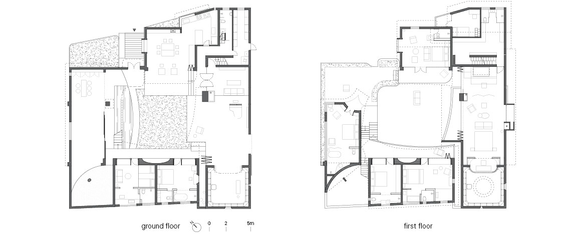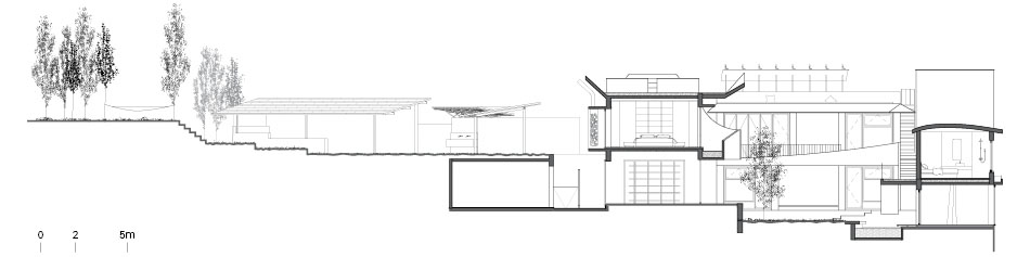 Around the front courtyard are arranged the yoga and meditation room, living room, master bedroom, dining room, guest room, and several service spaces. At the rear of the site are a storage room, wine cellar, drying area, woodworking studio, and a small campsite. In this house, where daily rhythms come together, a range of emotional tones emerges. Architecture responds to these subtle relationships and conveys a sense of living presence.