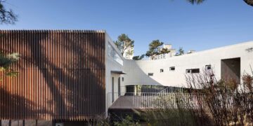 The Oak House, situated on a sloping site where oak trees thrive, fully embraces the surrounding natural environment. The house’s design and placement were determined by the location of trees and the adjacent water features, while large glass walls provide unobstructed views of the landscape. The blurred boundaries between interior and exterior, minimalist design, and an aura of timeless detachment reflect how the concrete structure integrates with nature.