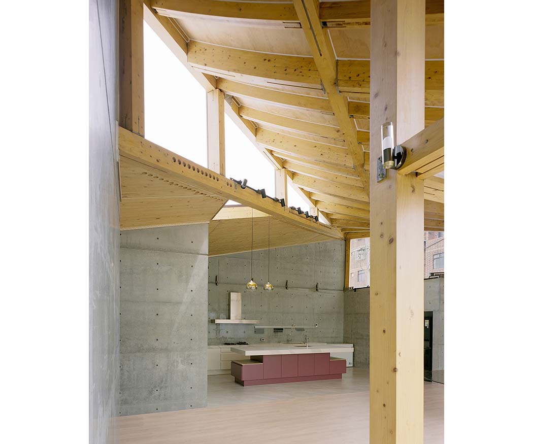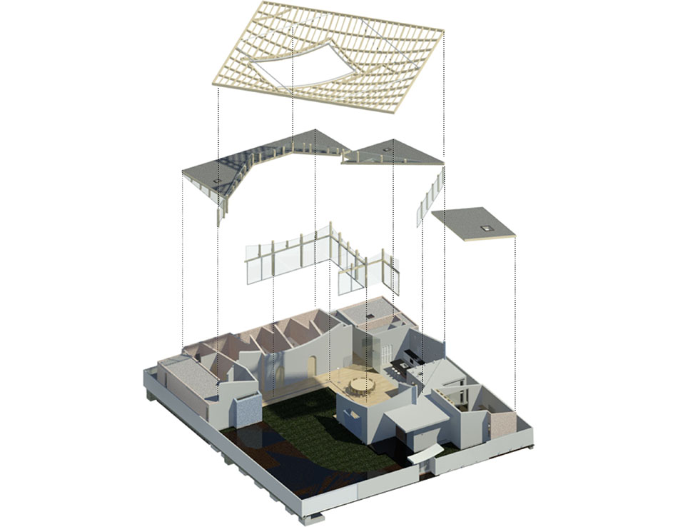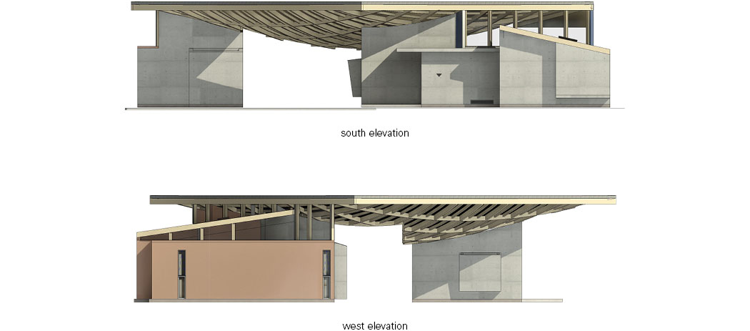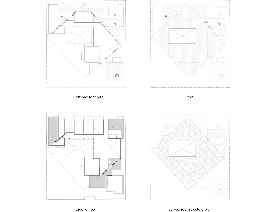 The timber roof Is the central element shaping both the building‘s form and its interior spaces. Set diagonally, the hyperbolic canopy creates varying light patterns between the floor plan and roof structure, filling the single volume with a diversity of environments. The combination of CLT and GLT enables long spans and complex curvatures that are difficult to achieve with conventional timber construction. At the outer edges, the column-free roof extends outward to form shaded transitional zones resembling deep eaves, naturally blurring the boundary between interior and exterior. The varying roof heights counteract the compact scale of the single-story layout, while the exposed timber framework revealed between levels adds spatial depth.