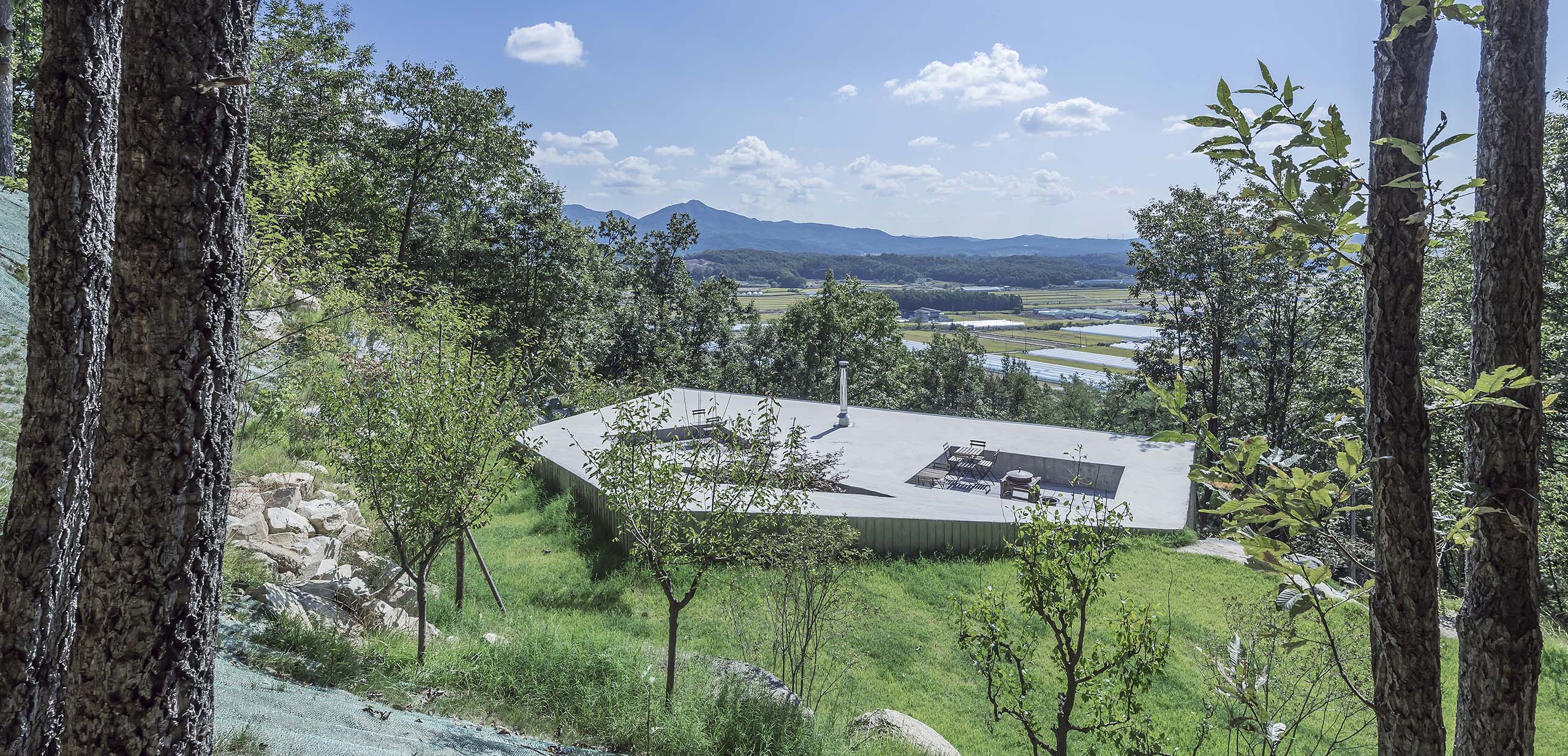 Blending with the topography partially embedded into the slope BCHO Partners Set amid peaceful mountains and rice fields an hour east of Seoul, Korea, the Tilt Roof...
