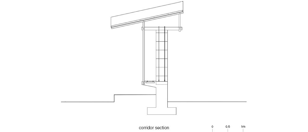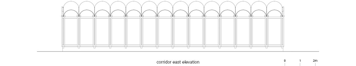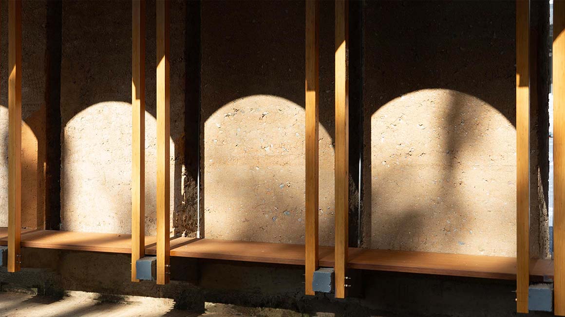 The structure places rammed earth walls on concrete piers, with bamboo beams and columns set above them. Bamboo, concrete beams, and steel columns support the earth walls, while steel beams and a wooden arched roof sit above. The cantilevered arched roof extends outward to establish structural balance, while the heaviness of concrete, the thickness of rammed earth, the lightness of bamboo, the fineness of steel, and the mass of wood create visual tension through contrast. Different materials transmit forces step by step to form a single structural system. The space is composed of repeating units. Arranged in a row, the units form a passageway that creates a boundary allowing movement between inside and outside. In a second phase, a vertical tower will be added to expand the spatial composition vertically.