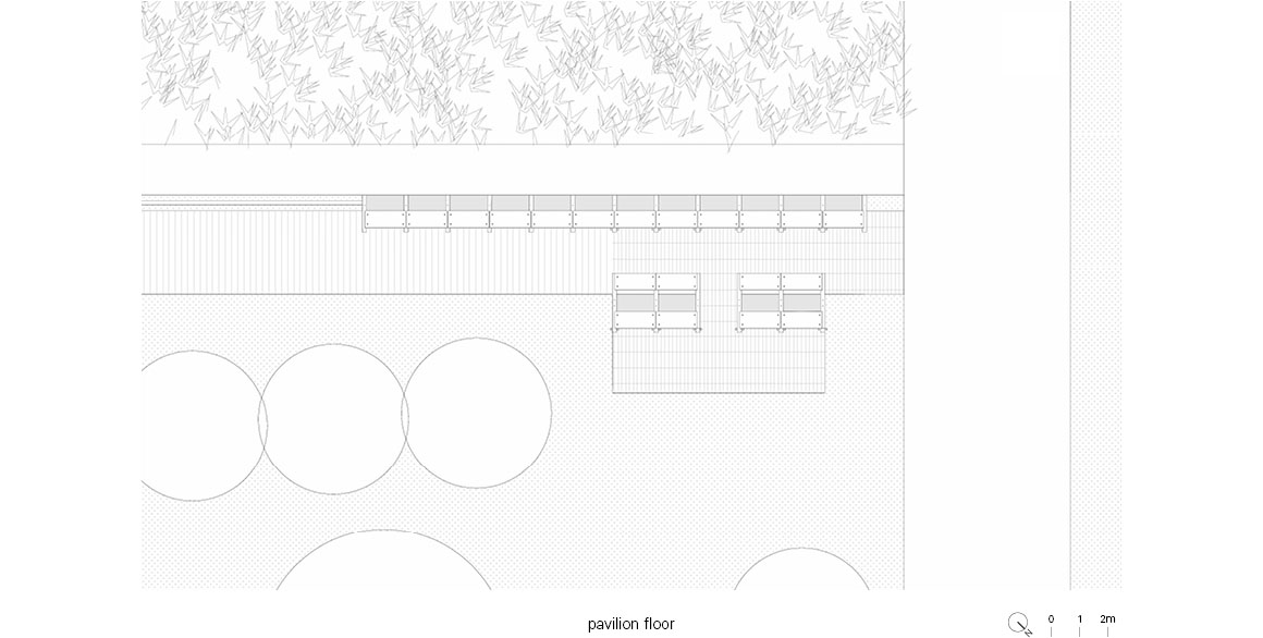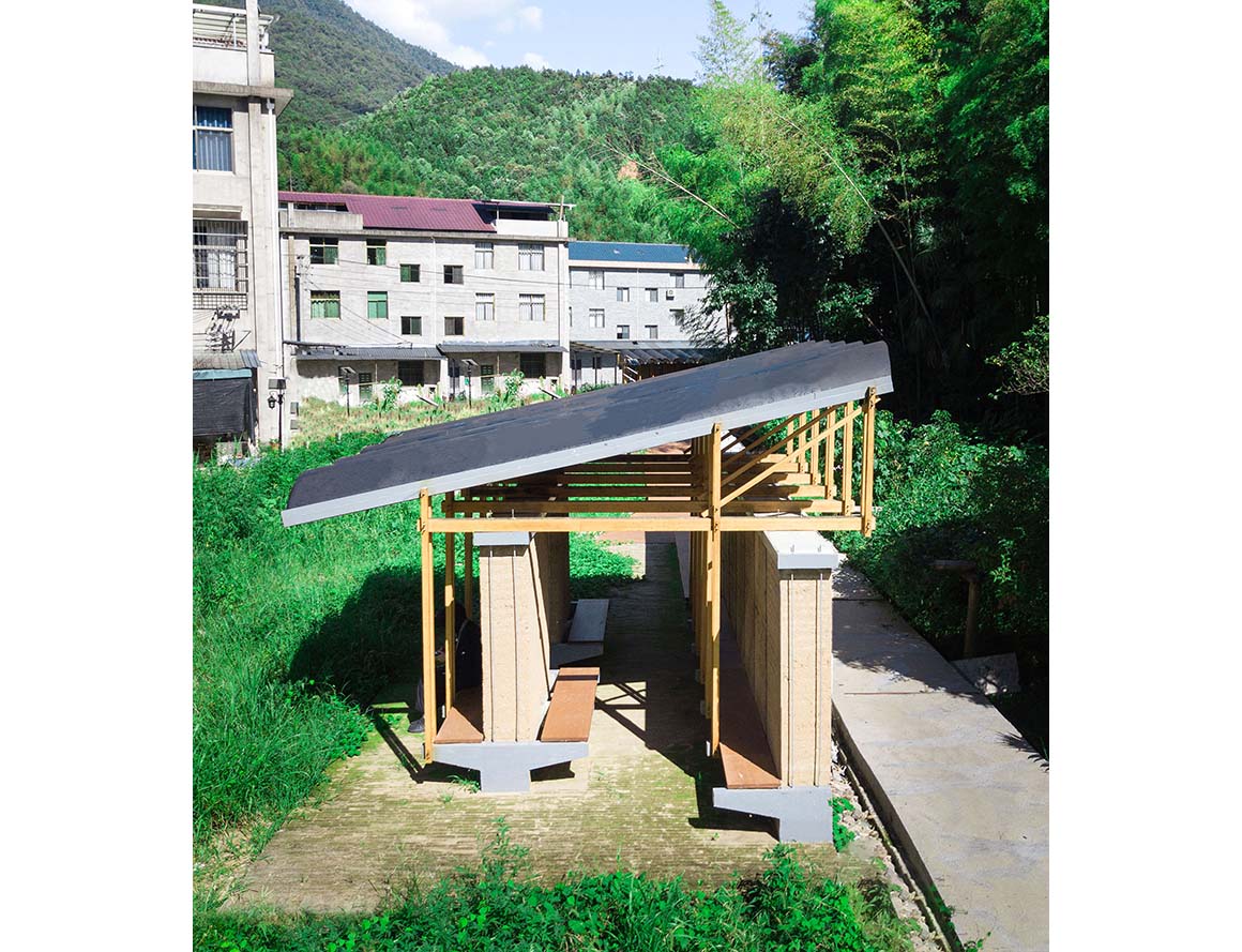The small pavilion, which creates a resting space beneath a cantilevered roof, began as a wall prototype exploring the balance between structure and form. Set in a village with old rammed earth houses and local craftsmen, it draws on the area‘s abundant bamboo resources alongside common materials such as concrete and steel. Their differing material properties form a symbiotic structural relationship. Combining materials that are readily available locally, the project can be seen as a small experiment exploring the possibilities of structure and space.