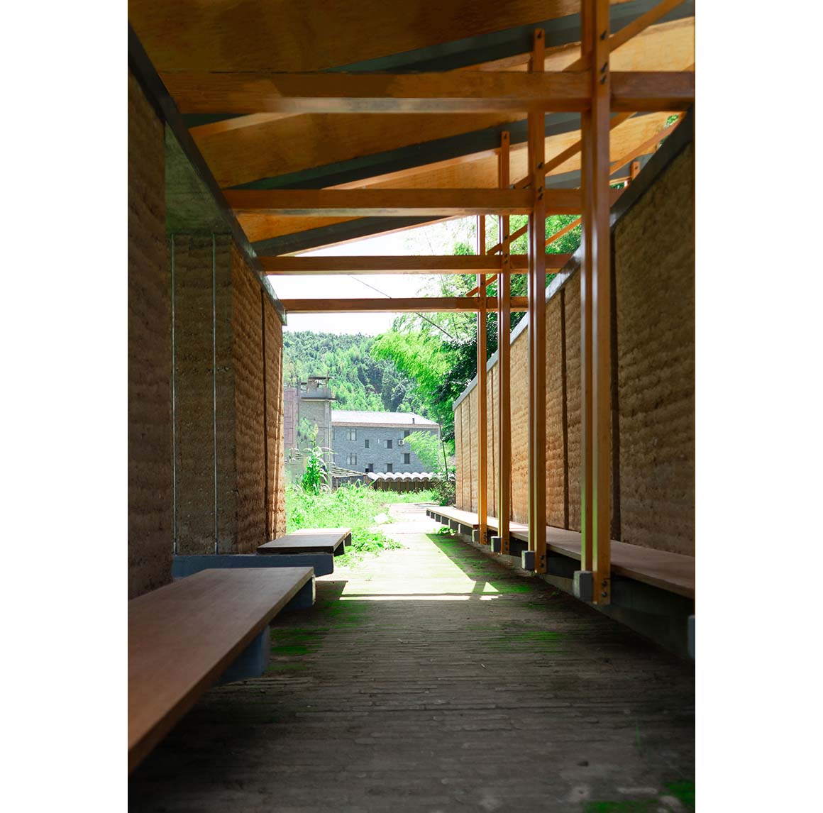 Project: Pomegranate Garden Micro Building / Location: Sanxia Village, Nanping, Fujian, China / Architects: Tumu+Meaningless Arch / Lead architect: Meaningless Arch_Jiaojiao Miao; TuMu_Hui Luo / Project team: Jiaojiao Miao, Hui Luo, Jieying Chen, Bingbing Wen / Structural consultant: AND Office_Zhun Zhang / Villagers: contractor_Shihao Dai; resident support_Fenzhen Chen, Zhengsheng Ye / Use: pavilion, gallery / Project area: planning_2,693m²; gallery_35m²; pavilion_39m² / Material: concrete, rammed earth, industrial bamboo, wood, steel / Design: 2024.7.~2024.9. / Construction: 2024.11.~2025.7. / Completion: 2025 / Photograph: Courtesy of the architect