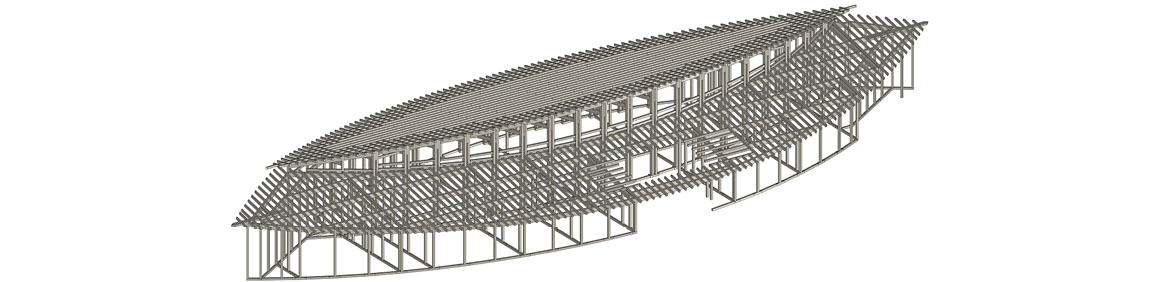 The nursery consists of six classrooms. Located beneath the lower roof, the classrooms have lower ceilings than the hall and are designed at a smaller scale aligned with children’s eye level. As the spaces where children spend most of their time, comfort and a sense of ease were carefully considered. Double columns measuring 120mm by 240mm, arranged at 1,820mm intervals to match plywood dimensions, line up like trees in a forest. Along this rhythm of columns, each space is defined from the hall while remaining spatially connected rather than fully separated. Planning the nursery as a single continuous space allows children to move freely indoors and avoids rigid divisions. The spatial configuration also ensures that activities in the hall are shared across the nursery.