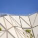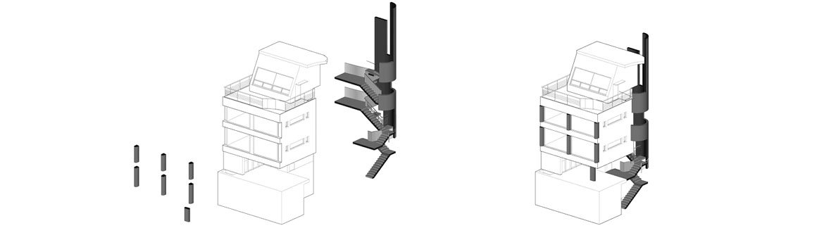 The building’s most distinctive feature is a flagpole-shaped staircase that rises above the roof and into the sky. The staircase’s skin, resembling a flagpole, is rounded to wrap around the building’s corners. The semicircular shape of the stairwell is reflected in the building’s columns, serving to enhance the building’s symbolism and recognition. The staircase’s dark color and rougher texture, compared to the rest of the building, accentuates its unique design.