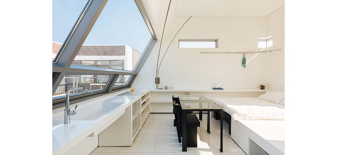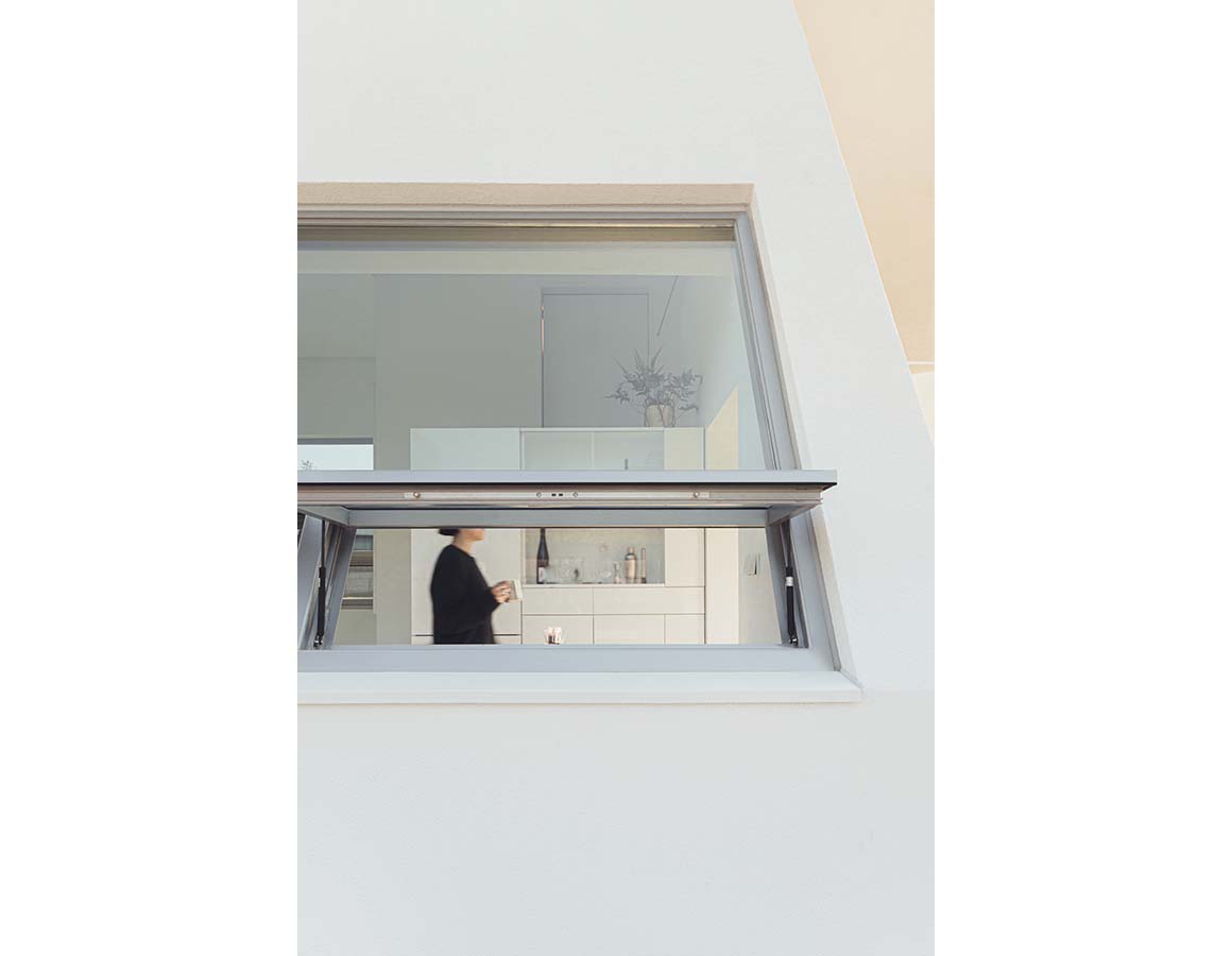 The fourth floor is significantly narrower than the second and third floors, but it offers a sense of openness due to the windows on three sides. The cut side of the fourth floor facing the terrace features a window enabling interaction between the inside and outside. The kitchen located beside the window allows for quick delivery of prepared food to the terrace for outdoor dining.