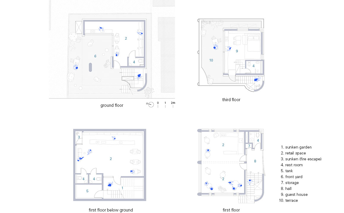 The second and third floors are divided into two spaces, reflecting the characteristics of Mangwon’s small shops. Additionally, about half of the first floor’s total area features an outdoor space, the yard, which extends the road, naturally connecting pedestrians to the store.
