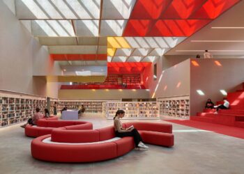 Above these neighboring houses, however, the mature tree canopy and sky are alive, constantly changing and breathtaking. Focusing on this view “up” rather than horizontally “out” the architects created a seemingly roofless house that surrounds the living spaces by huge outdoor courtyards that direct the view upwards.