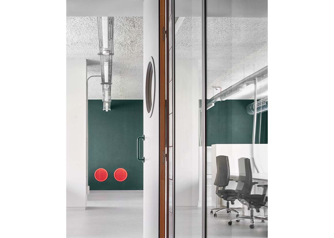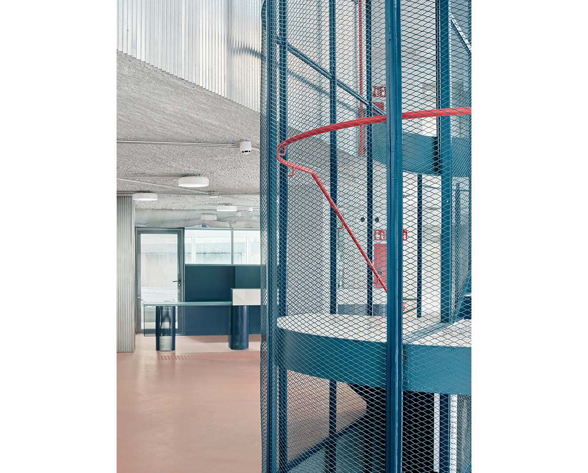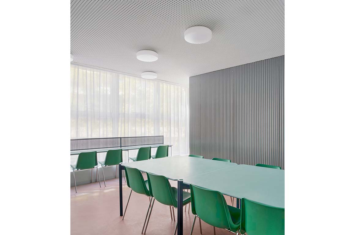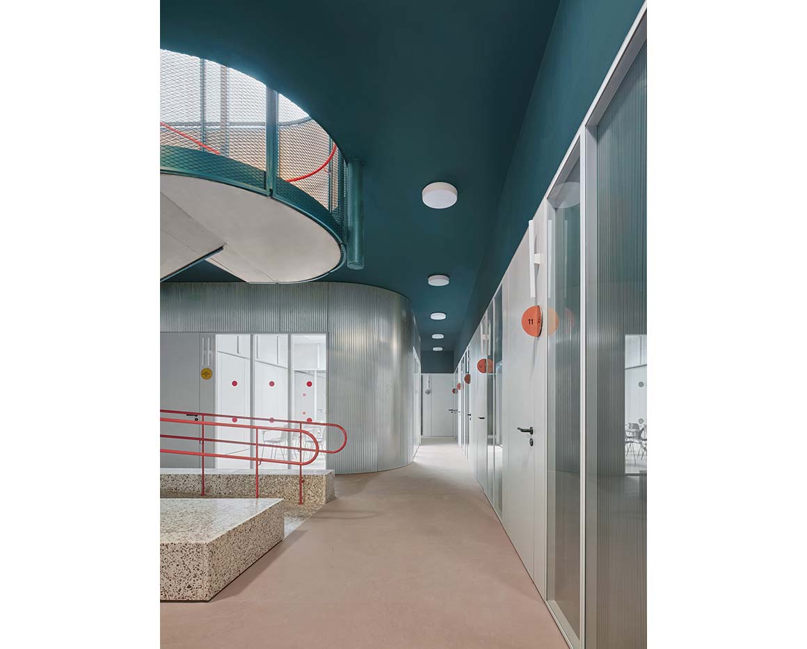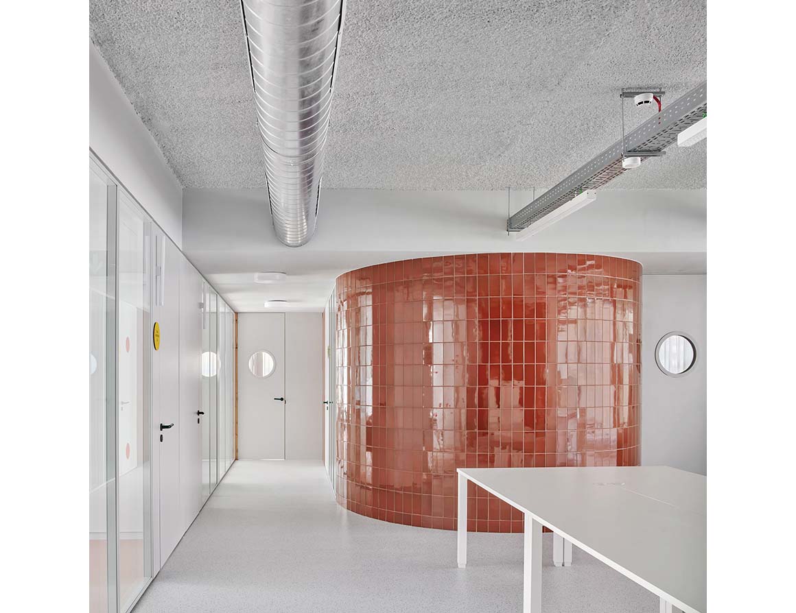 To avoid the monotonous repetition typical of office buildings, geometric elements and a wide range of materials were actively employed so that no two floors feel the same. Central to this strategy is the juxtaposition of industrial materials with handcrafted ones. Materials such as glazed tiles, spray-applied mortar ceilings, and terrazzo contrast with industrial materials including metal panels, wire mesh, and linoleum, creating a rich tactile experience. Assembly methods also reflect a DIY sensibility, lending individuality to the spaces while emphasizing the traces of delicate craftsmanship. The combination of custom-designed furniture and furniture designated by the city council allows the space’s distinct character and home-like atmosphere to emerge simultaneously. As the installation of external shading devices was not permitted, heat-reflective curtains were installed indoors to control solar gain. The gravel-covered roof was converted into a green roof, increasing thermal mass and reducing heat absorption. As a result, the building’s energy demand was significantly reduced, bringing it into line with contemporary sustainability standards.