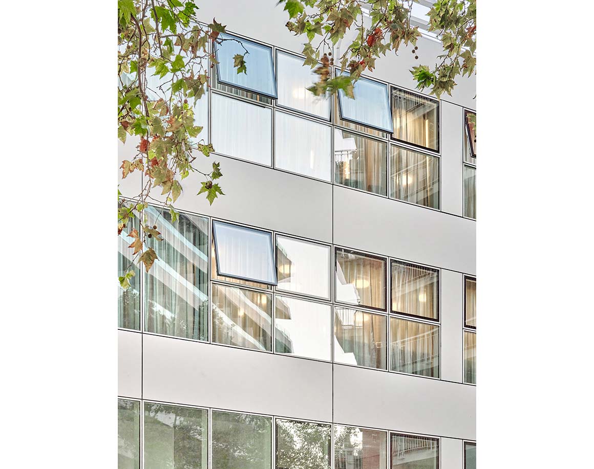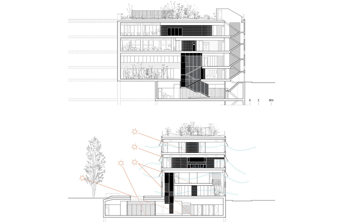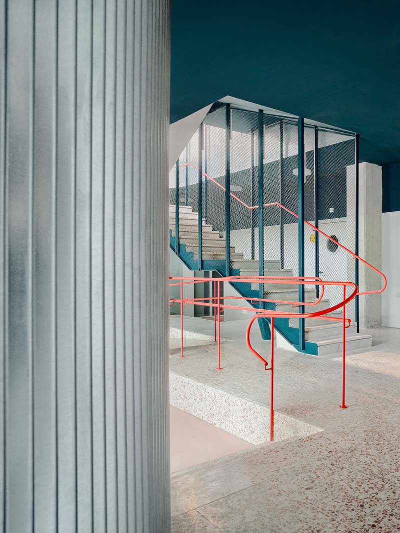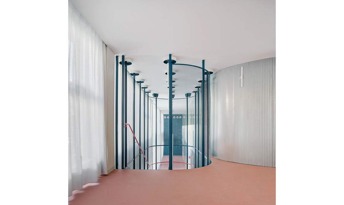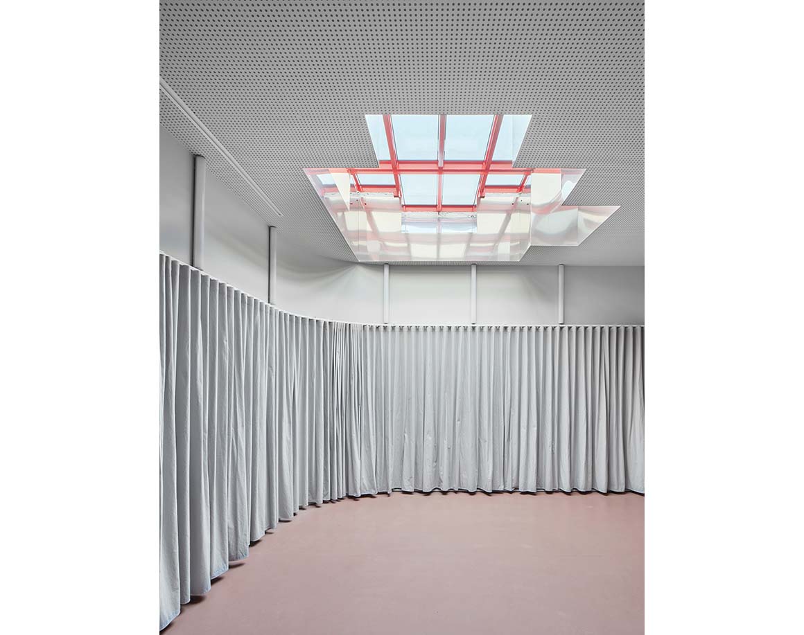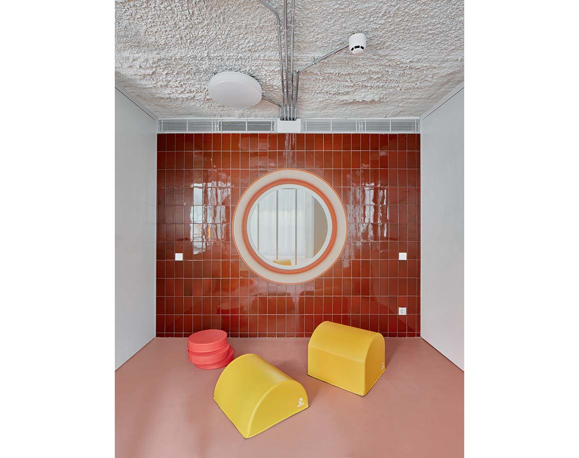 To avoid the monotonous repetition typical of office buildings, geometric elements and a wide range of materials were actively employed so that no two floors feel the same. Central to this strategy is the juxtaposition of industrial materials with handcrafted ones. Materials such as glazed tiles, spray-applied mortar ceilings, and terrazzo contrast with industrial materials including metal panels, wire mesh, and linoleum, creating a rich tactile experience. Assembly methods also reflect a DIY sensibility, lending individuality to the spaces while emphasizing the traces of delicate craftsmanship. The combination of custom-designed furniture and furniture designated by the city council allows the space’s distinct character and home-like atmosphere to emerge simultaneously. As the installation of external shading devices was not permitted, heat-reflective curtains were installed indoors to control solar gain. The gravel-covered roof was converted into a green roof, increasing thermal mass and reducing heat absorption. As a result, the building’s energy demand was significantly reduced, bringing it into line with contemporary sustainability standards.