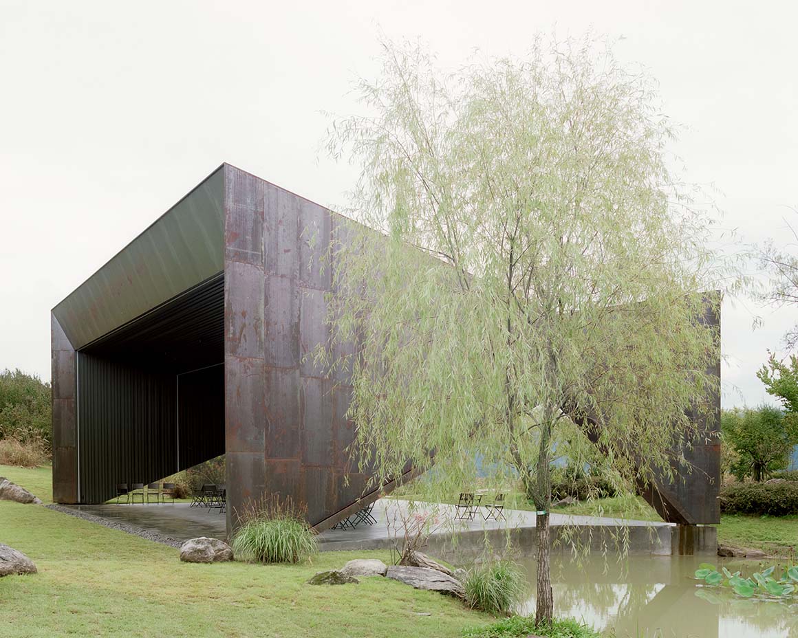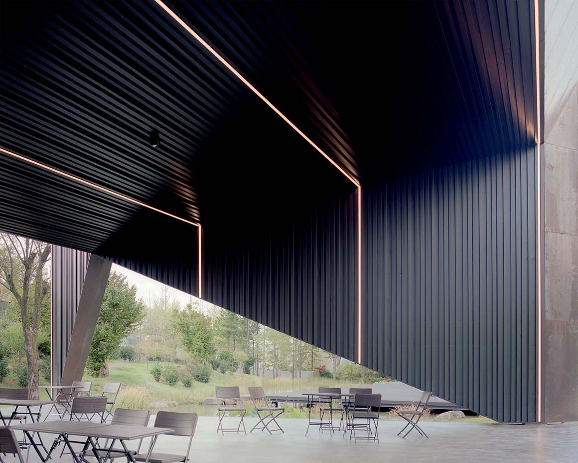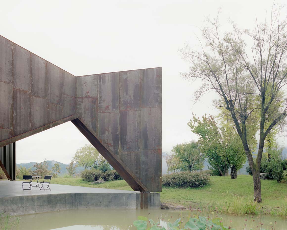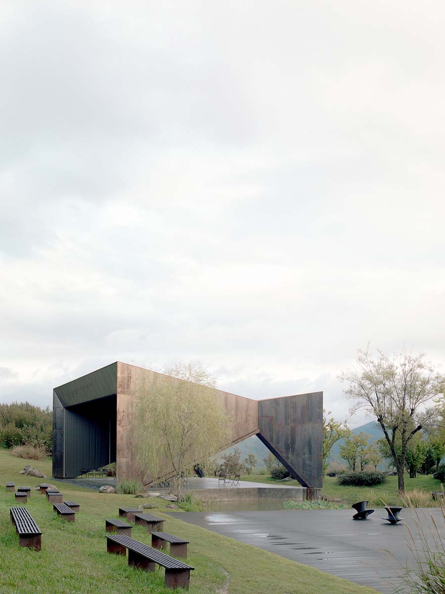 The corten steel exterior will gradually weather to a deep reddish tone, blending with the colors of the surrounding vegetation. Seen from afar, the pavilion reads as a sharp geometric mark on the hillside, yet up close it appears as a thin membrane lightly resting on the ground. Rather than asserting itself as an object, the structure frames the existing terrain and allows the landscape to become the principal stage, completing the spatial sequence of movement through Sayuwon.