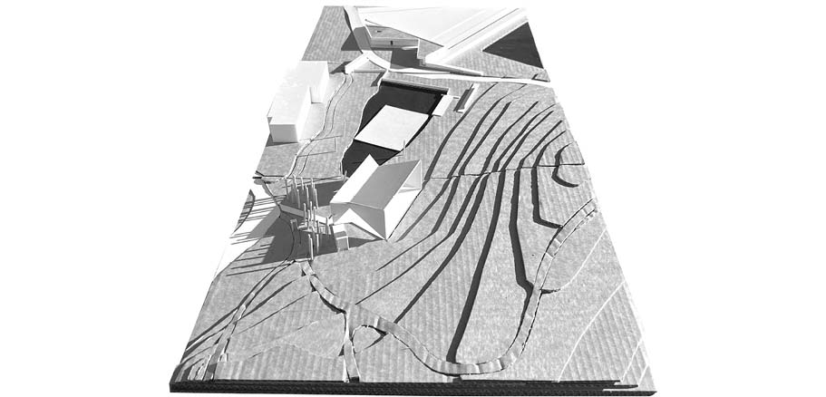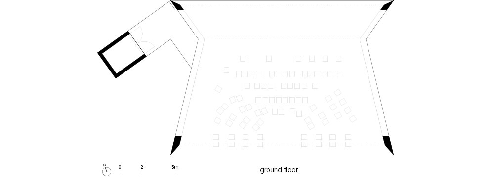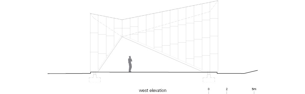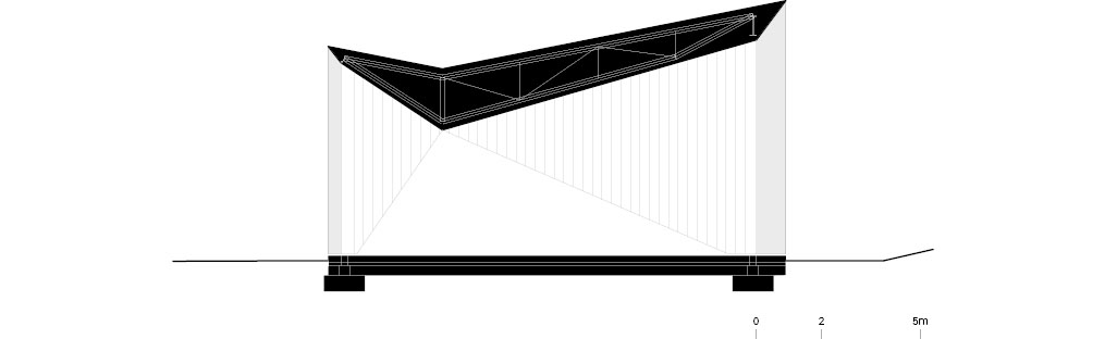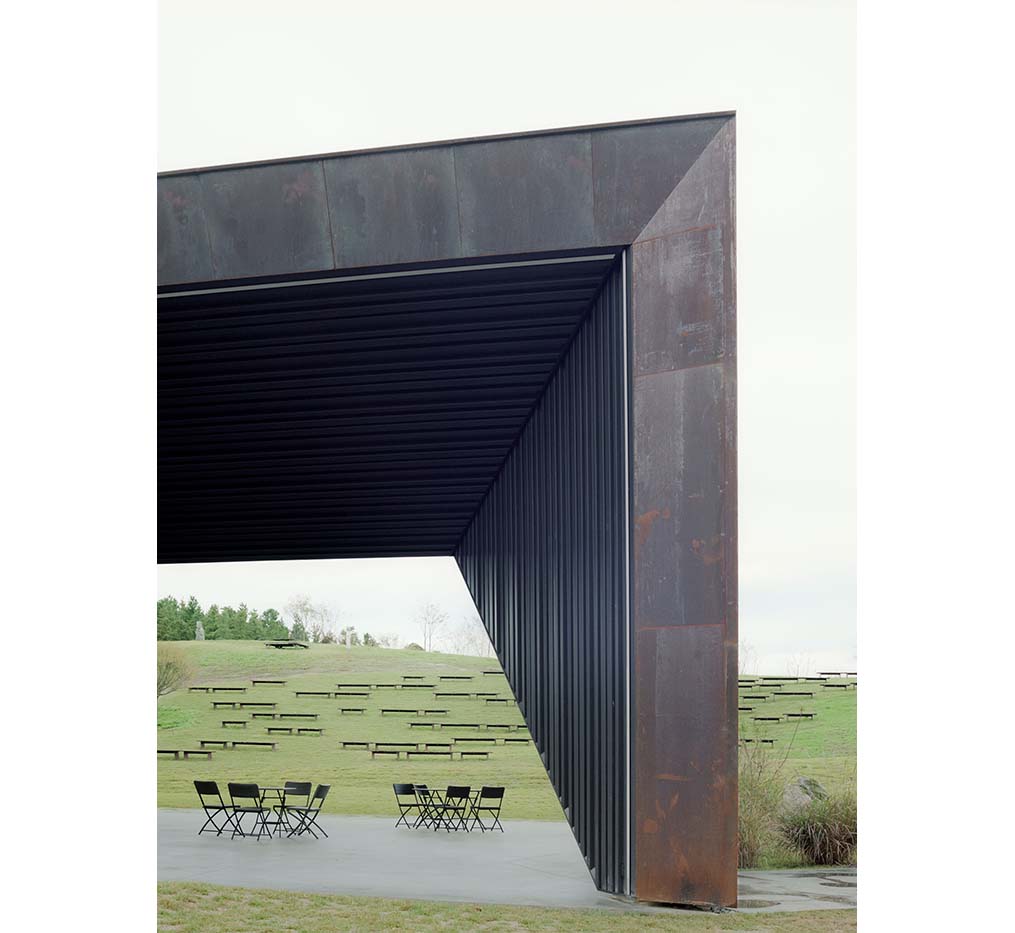 Seats arranged along the natural topography descend gently to form a stepped audience area for approximately 250 people. Where the slope meets a reflecting water surface below, the pavilion touches the ground at only four points, completing an open-air performance venue. The approximately 20 × 14 meter space opens toward the surrounding scenery, functioning both as a stage for concerts and outdoor events and, in everyday use, as a sheltered resting place offering protection from rain and sun. Rather than imposing a new order, the structure clarifies a condition already latent in the terrain, allowing the slope, water, and sky to work together as a natural amphitheater.