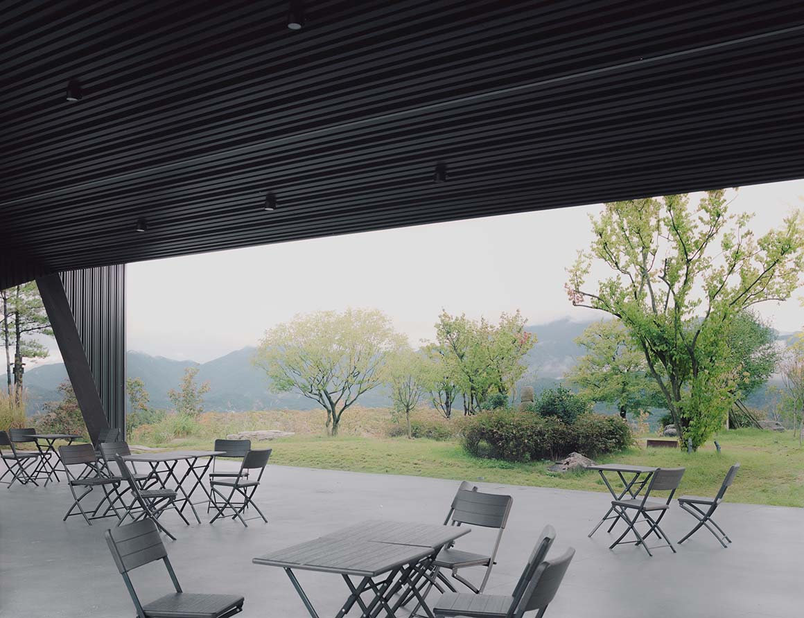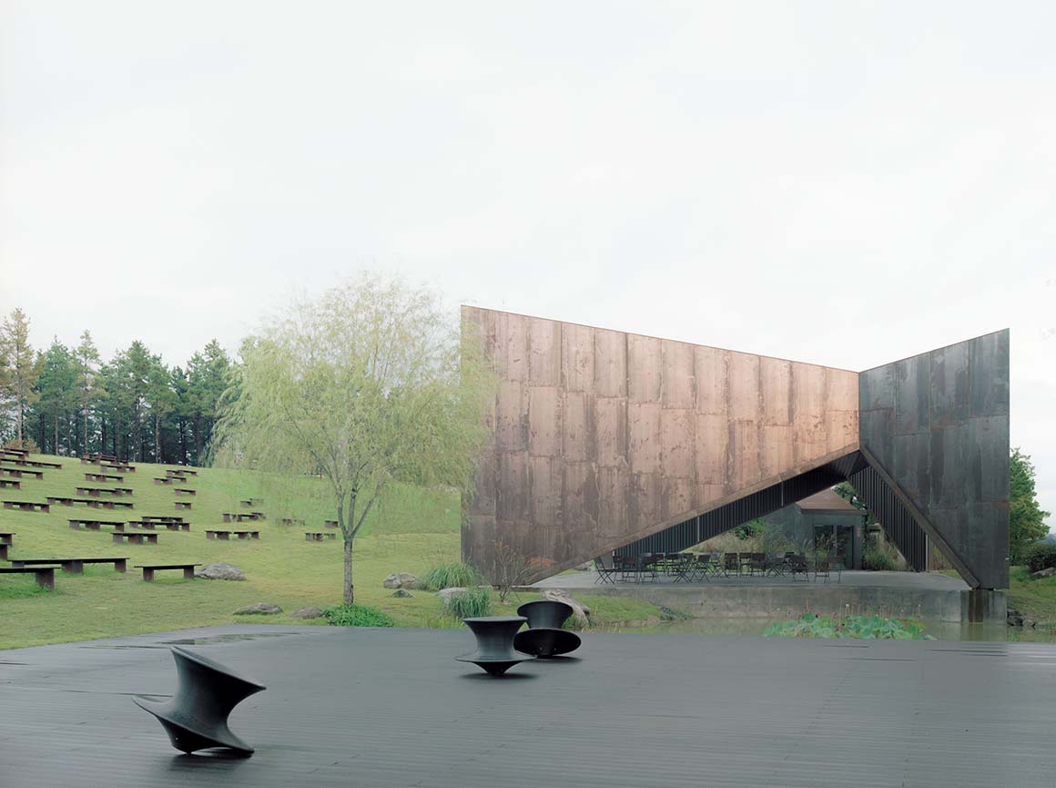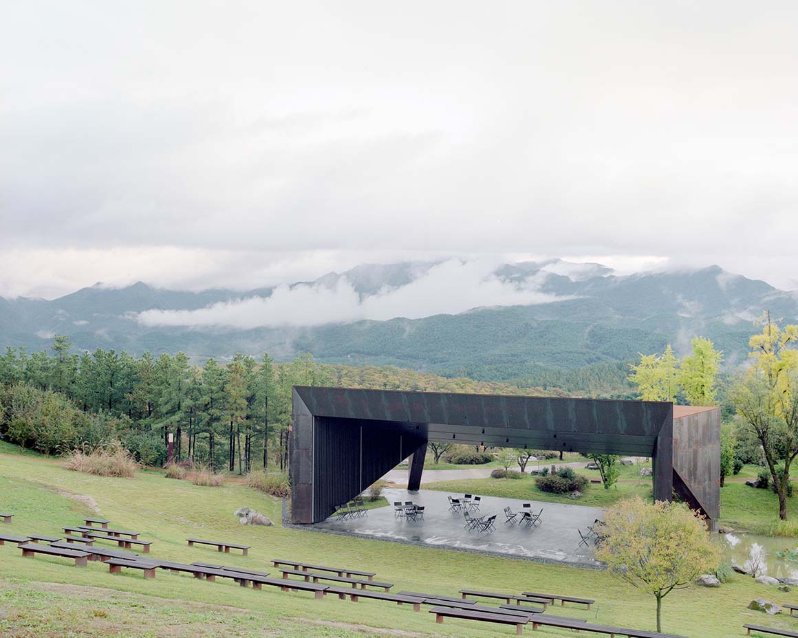 Along the ridges and valleys extending from Palgongsan in Gunwi, Gyeongsangbuk-do, Sayuwon unfolds as a private park conceived by Chairman Yoo Jaesung. Opened to the public in 2020, the 330,000m² site brings together preserved trees, collected stones, and architectural interventions by internationally recognized figures including Alvaro Siza, Seung H-sang (IROJE), Wook Choi, Matsunobu Kawagishi, and landscape architect Jung Young-sun. Paths follow the existing terrain, leading visitors across slopes and through wooded areas in a sequence of spatial episodes. Near the culmination of this route, a performance pavilion appears, lightly set upon a grassy incline and establishing a distinct moment within the terrain.