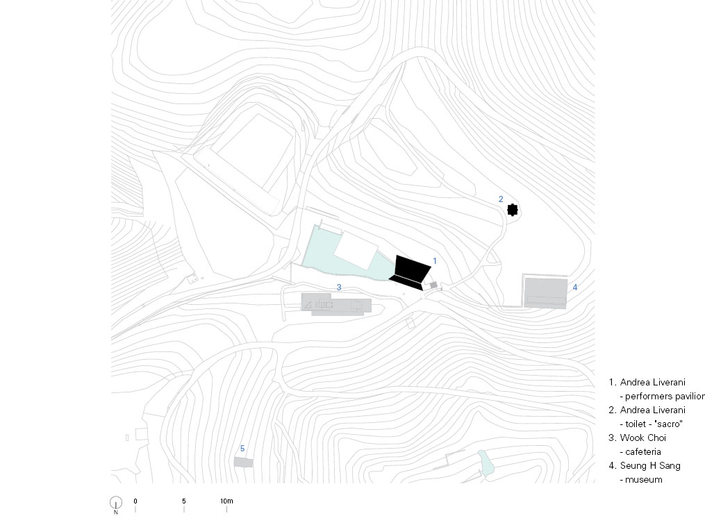 Project: Sayuwon Park Performance Pavilion / Location: 1176, Chisanhyoryeong-ro, Bugye-myeon, Gunwi-gun, Daegu, Republic of Korea / Architect: Liveraniandrea.com (Andrea Liverani) / Project management: JeeHong Kim / Local architect: JaeHyuk Kim / Engineer: Dooru Engineering.Co.Ltd / Lighting engineer: Bitzro architectural Lighting Design / Contractor: Insung Gene Al Construction Co, Ltd / Client: Sayuwon Co., Ltd (JaeSung Yoo) / Use: pavilion / Site area: 330,000m² / Bldg. area: 280m² / Completion: 2025 / Photograph: ©Simone Bossi (courtesy of the architect)