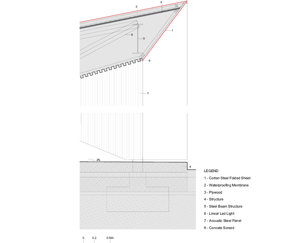 The design is based on the idea of folding. Sheets of corten steel are precisely folded to form both roof and walls, blurring the distinction between structure and envelope and creating a continuous surface. This approach secures structural stiffness without additional reinforcement while reducing material thickness, giving the heavy steel a light, tent-like presence. In both plan and section, the geometry tapers toward the stage. Resembling a megaphone, this form concentrates sound and directs attention to the performance area, drawing the surrounding sky and mountains into the composition. Inside, acoustically profiled metal panels help focus sound and deliver it clearly to the audience, reinforcing the spatial relationship between stage and landscape.