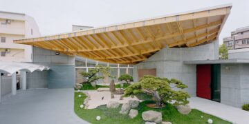Against the backdrop of a skyline woven with mountain ranges like a folding screen, the view expands with grandeur, embracing the lower village where a river flows below the slope. The vigor of nature blends with the flowers, trees, and grass growing in the front yard, weaving a colorful narrative. Within this architectural space completed by borrowed scenery, The architectural space, which is completed with a secondary view, allows for a generous embrace of the world and nature.