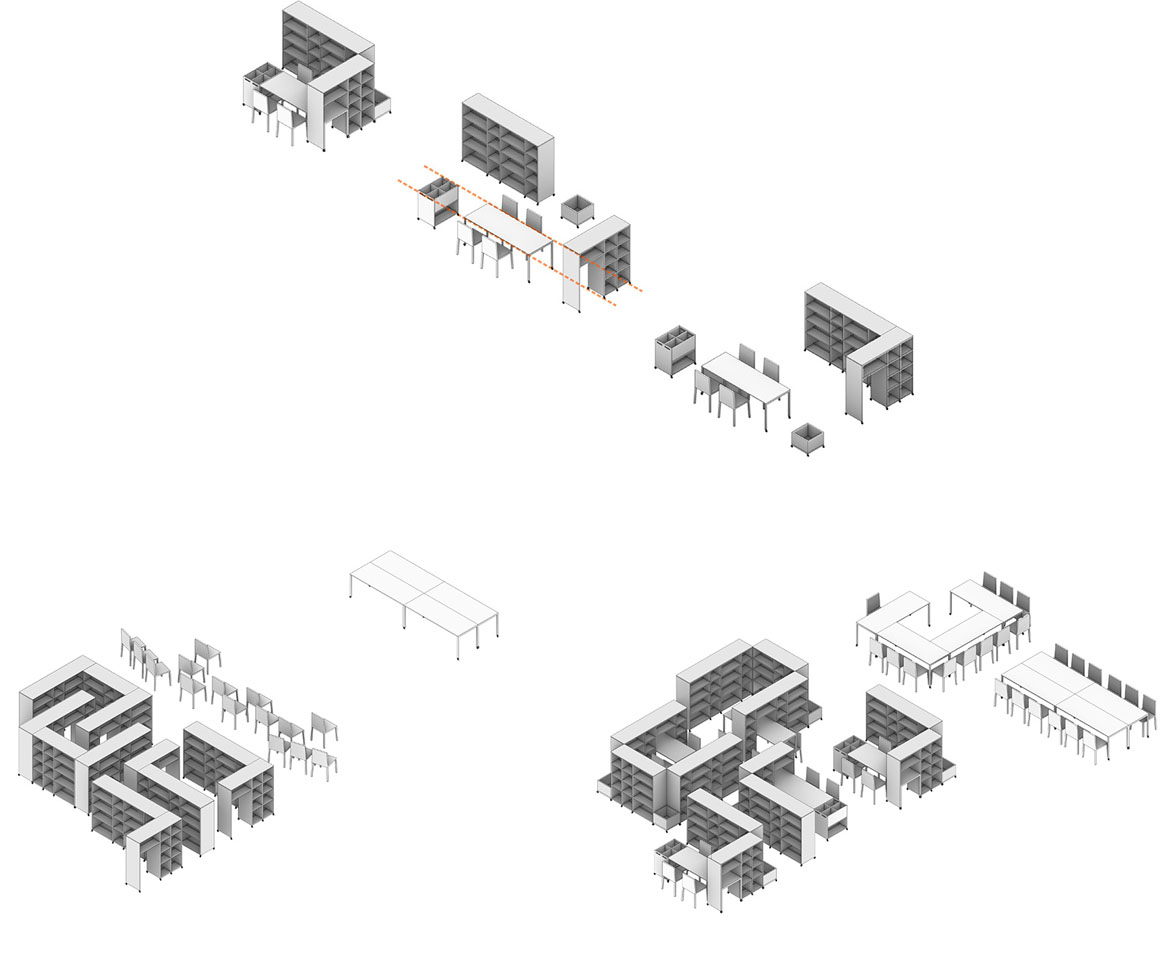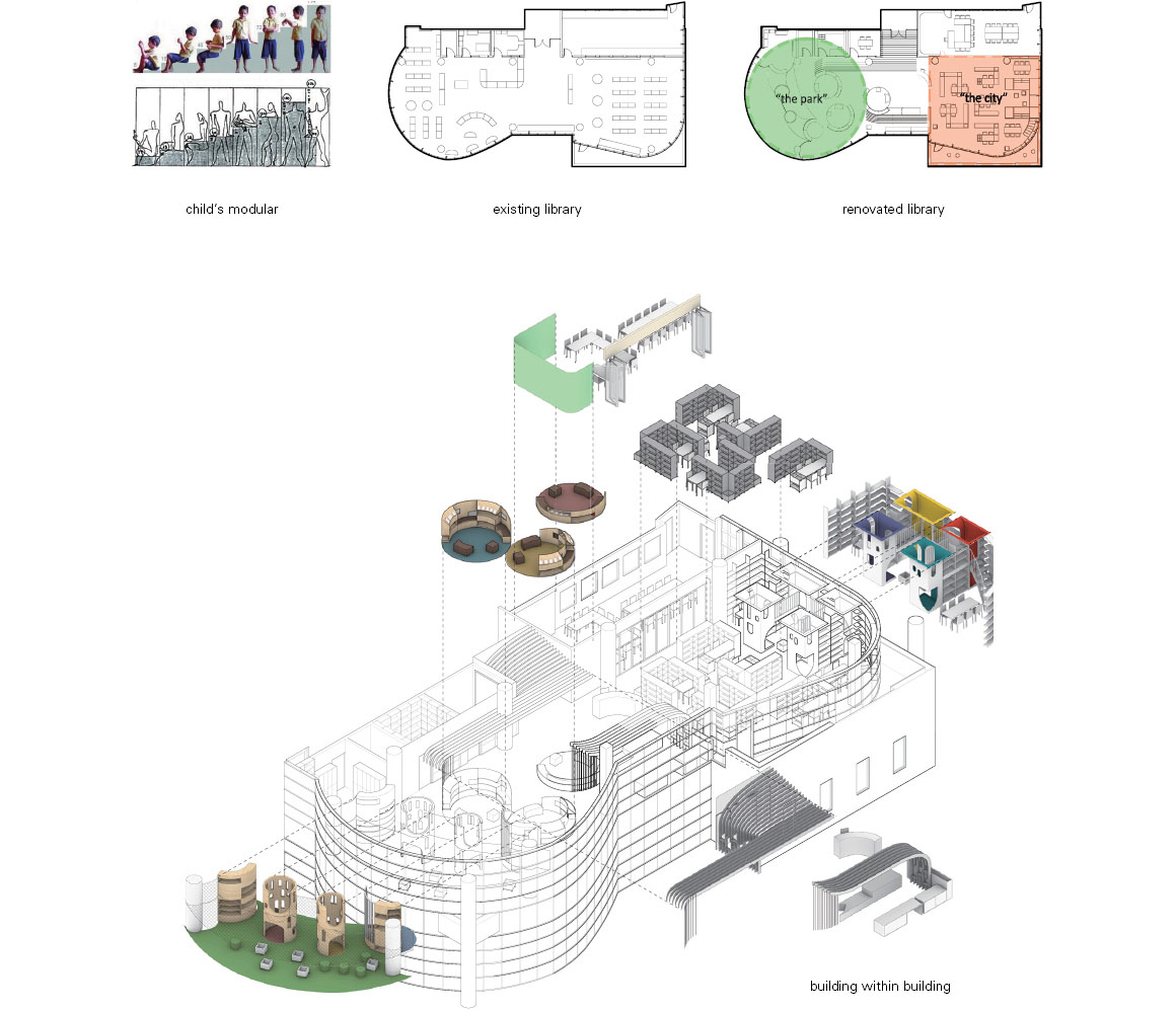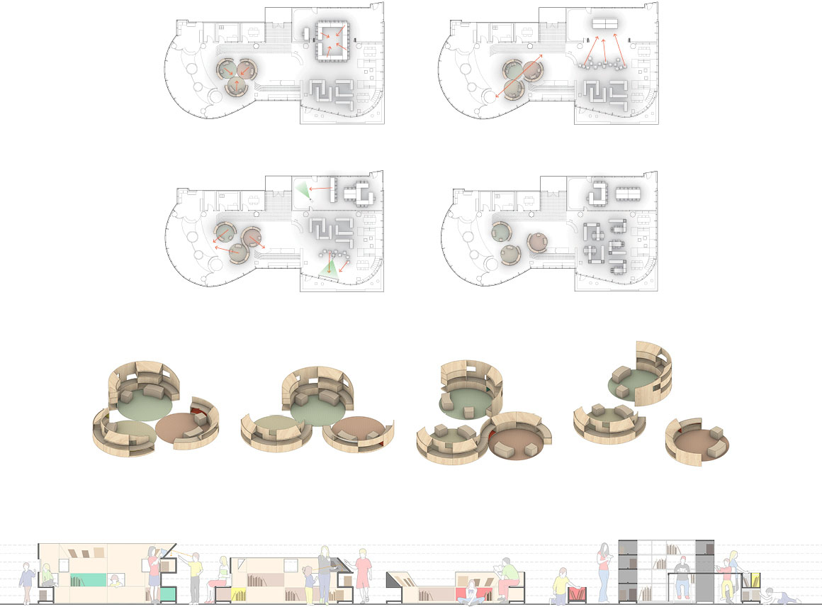 The overall organization of the renovation is a response to the existing idiosyncratic building massing: The given interior floor plate appears as two oddly shaped lobes, one circular the other cubic. The northern circular envelope is reconceptualized as an urban park with free-form semi-circular shelving relating back to the existing curve of the building. This modular furniture can be reconfigured to support various diverse gatherings and circulation paths. On the south side, the rectangular floor plate lends itself to a denser ‘city block’ feel. Book stacks intersected with moveable desks act as building blocks for individual and collective study. A large conference room defined by glass folding partitions can either extend this space’s activities or close it off for acoustic separation.