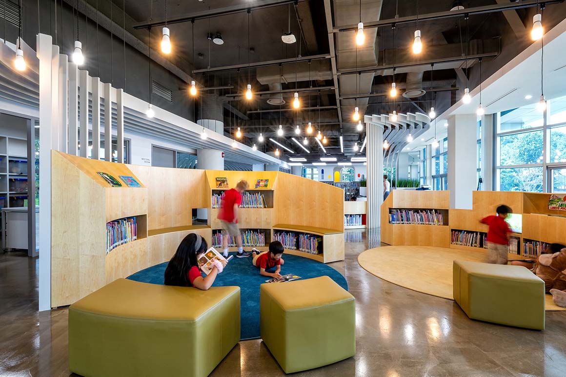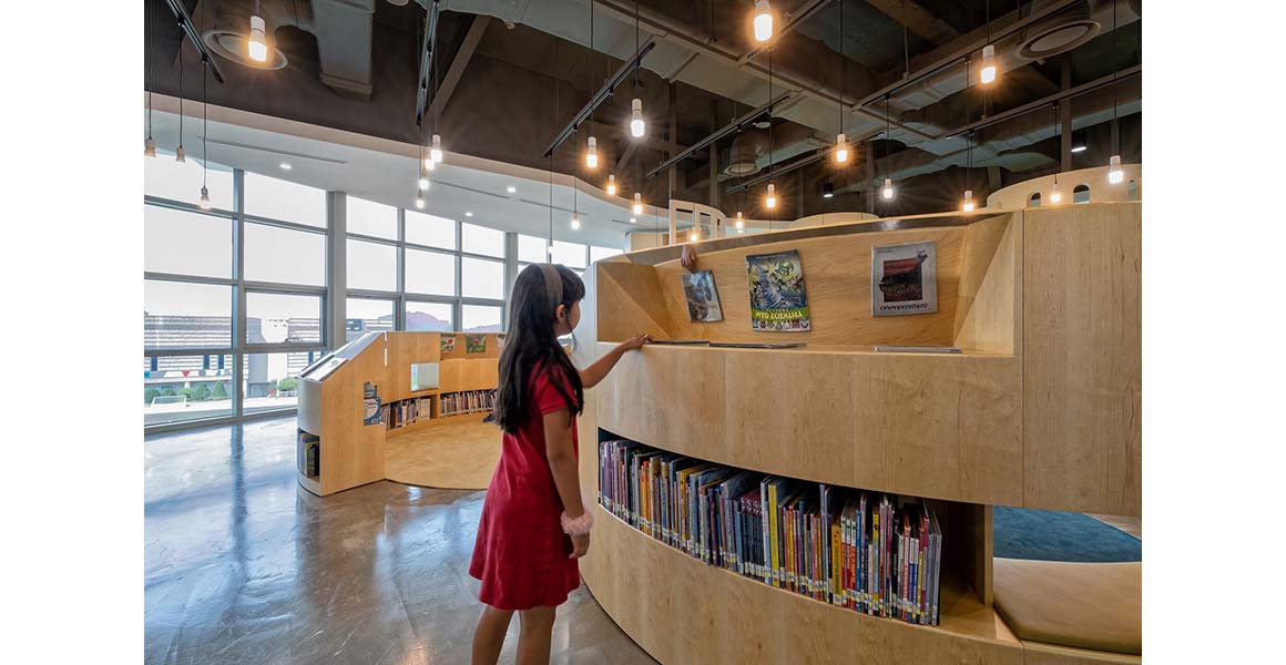 Because children grow rapidly, the spatial extension of their bodies beyond what they can literally touch is also important to the concept of egalitarian proportion. Gaps in the bookshelves form low ‘windows’ for young children, equivalent to the long views available to older students and adults. The use of mirrored stainless steel extends their views in various ways: at the entrance to expand views to the campus beyond and on the underside of display bookshelves to extend the visual reach of smaller children.
