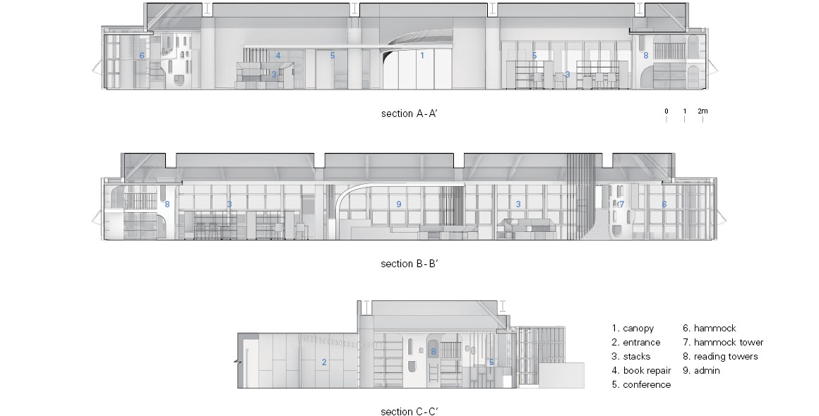 By updating the inefficient HVAC system, 45cm of gained ceiling height allows for a series of reading towers at the far ends of the space. The northern towers support a hammock that blends the spontaneity of the playground with the function of the library. On the southern end, four reading towers support semi-hidden mezzanines reminiscent of 19th century libraries. The tower windows reference historical structures to inspire ‘future memories’ for when the children are old enough to travel.