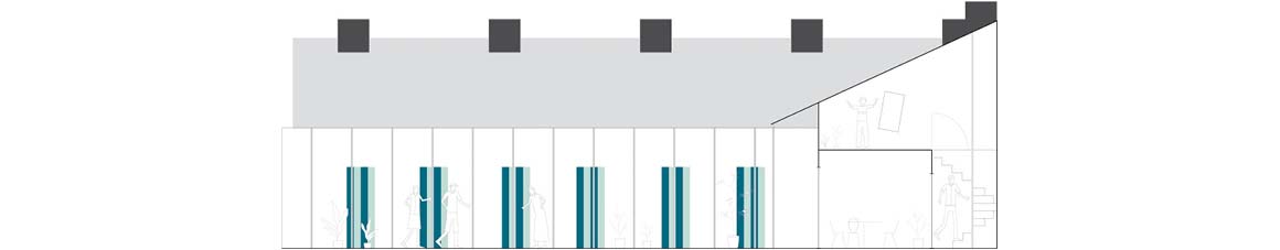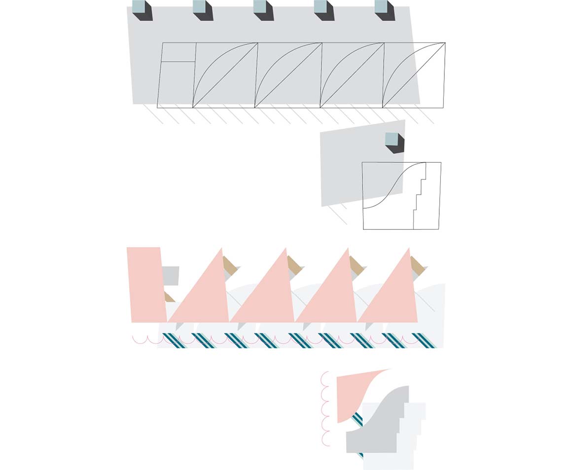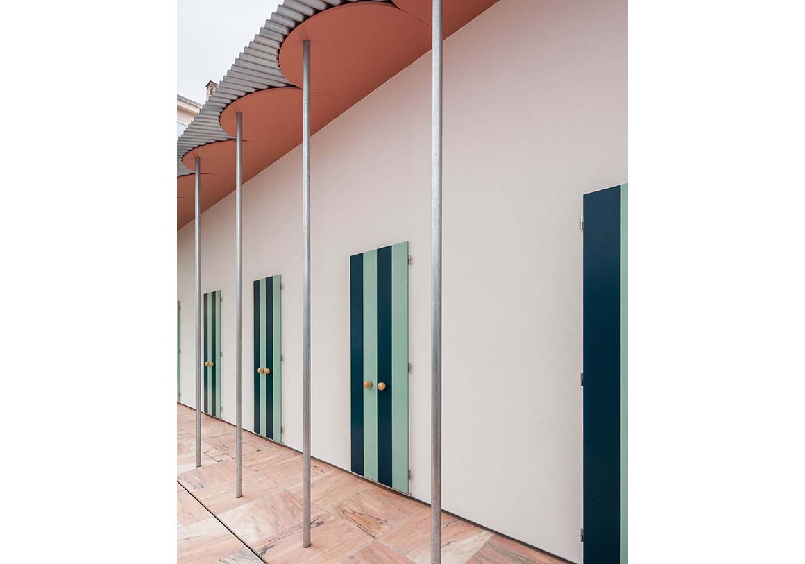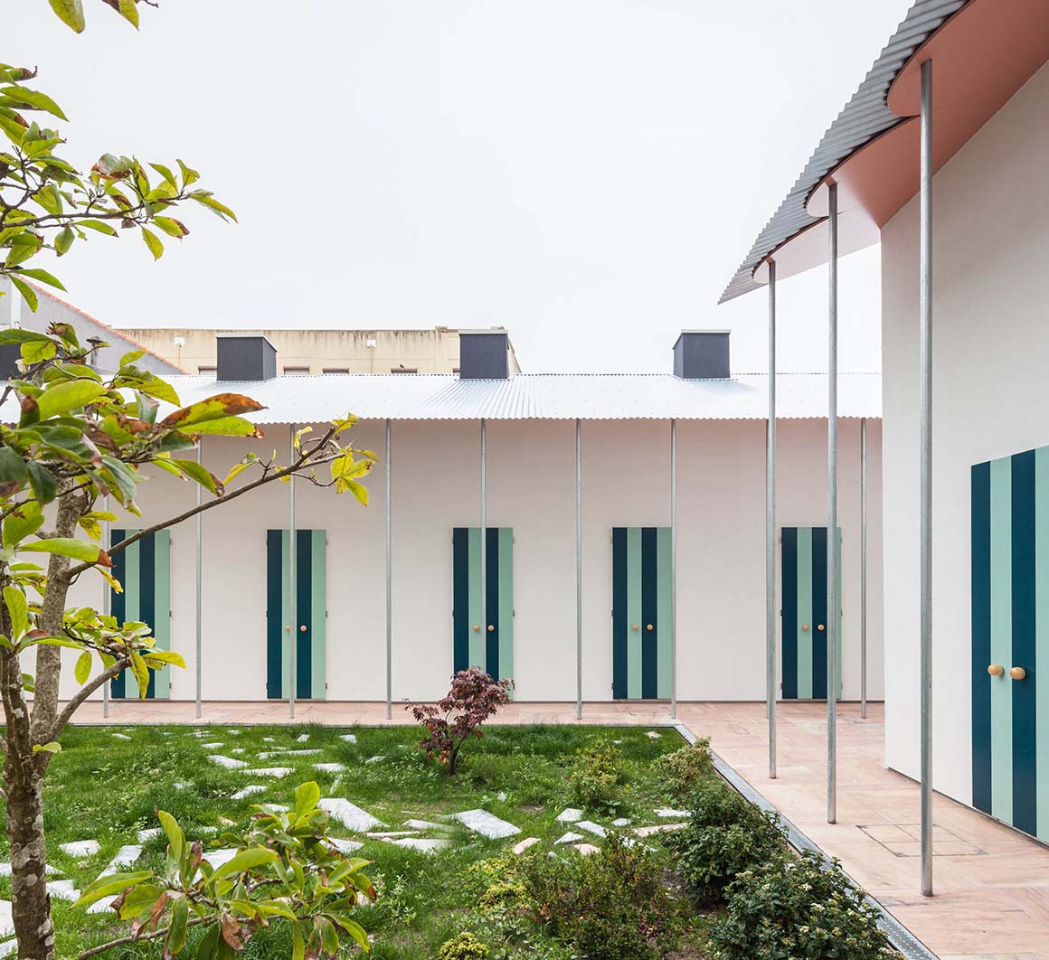 On the outside, the houses are defined by a continuous colonnade framing a collective garden, whereby it becomes impossible to determine where each house begins or ends. The façade is an overlap of several rows, rhythmically arranged: thin metal columns, striped blue doors and black, boxy skylights. The roof is comprised of two layers: a pink wavy plane is attached below the metal sheets, emphasizing the thinness of the surface. Around the building is the idyllic urban scenario of Porto, forming a backdrop to this honest and radical architectural exercise.
