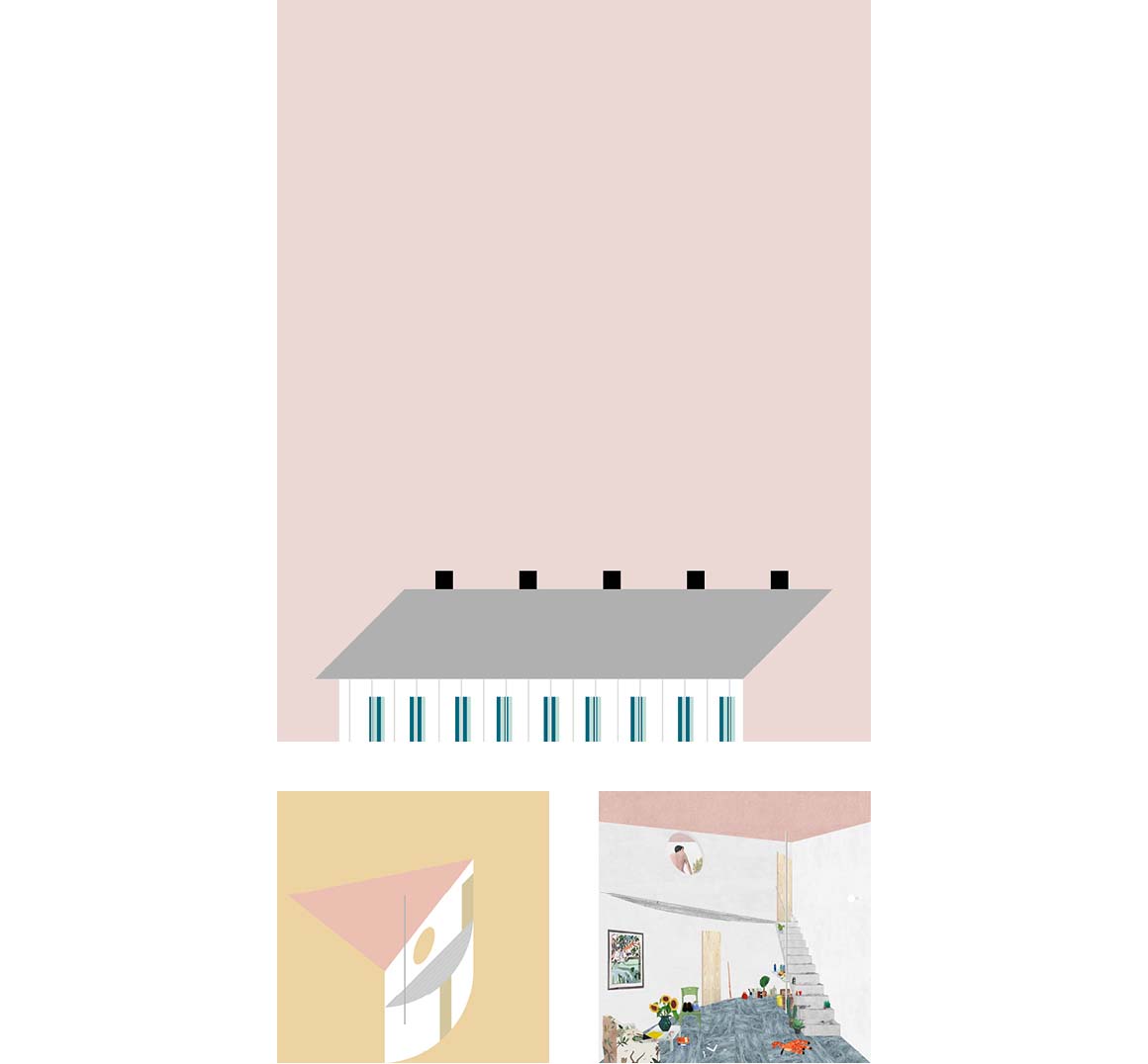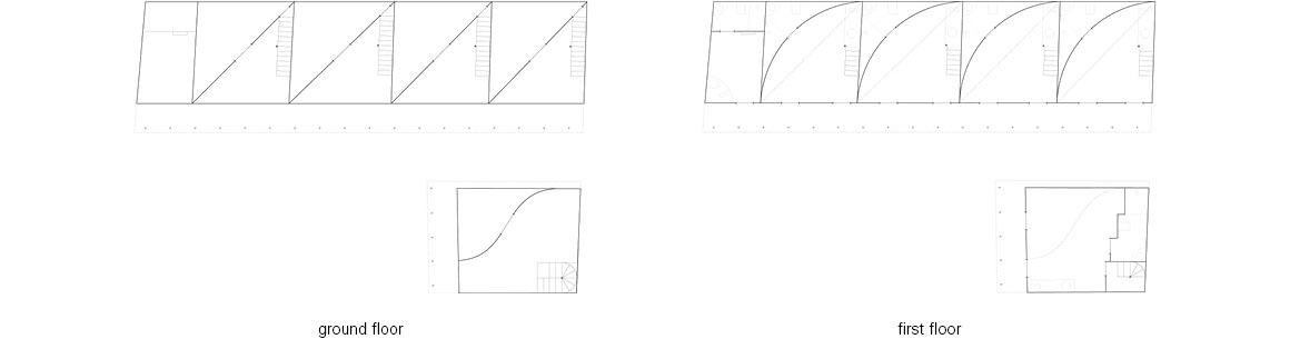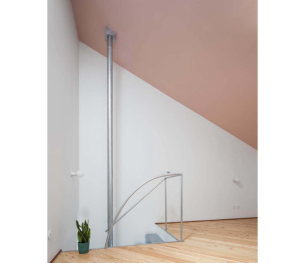The composition of each inner space combines orthogonal, diagonal and curved lines. The slightly distorted perimeter of the rooms sets the frames; the main spaces come from a subtraction of conflicting surfaces that comprise secondary programs. The thin metal poles bring in vertical tension while the round openings connect uneven programs. Acting within a very small volume, this combination of ambivalent geometries achieves unconventionally-shaped living rooms.