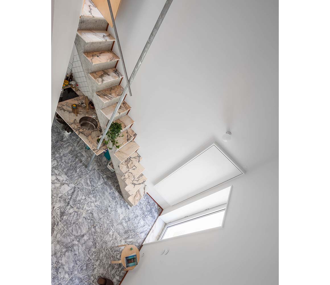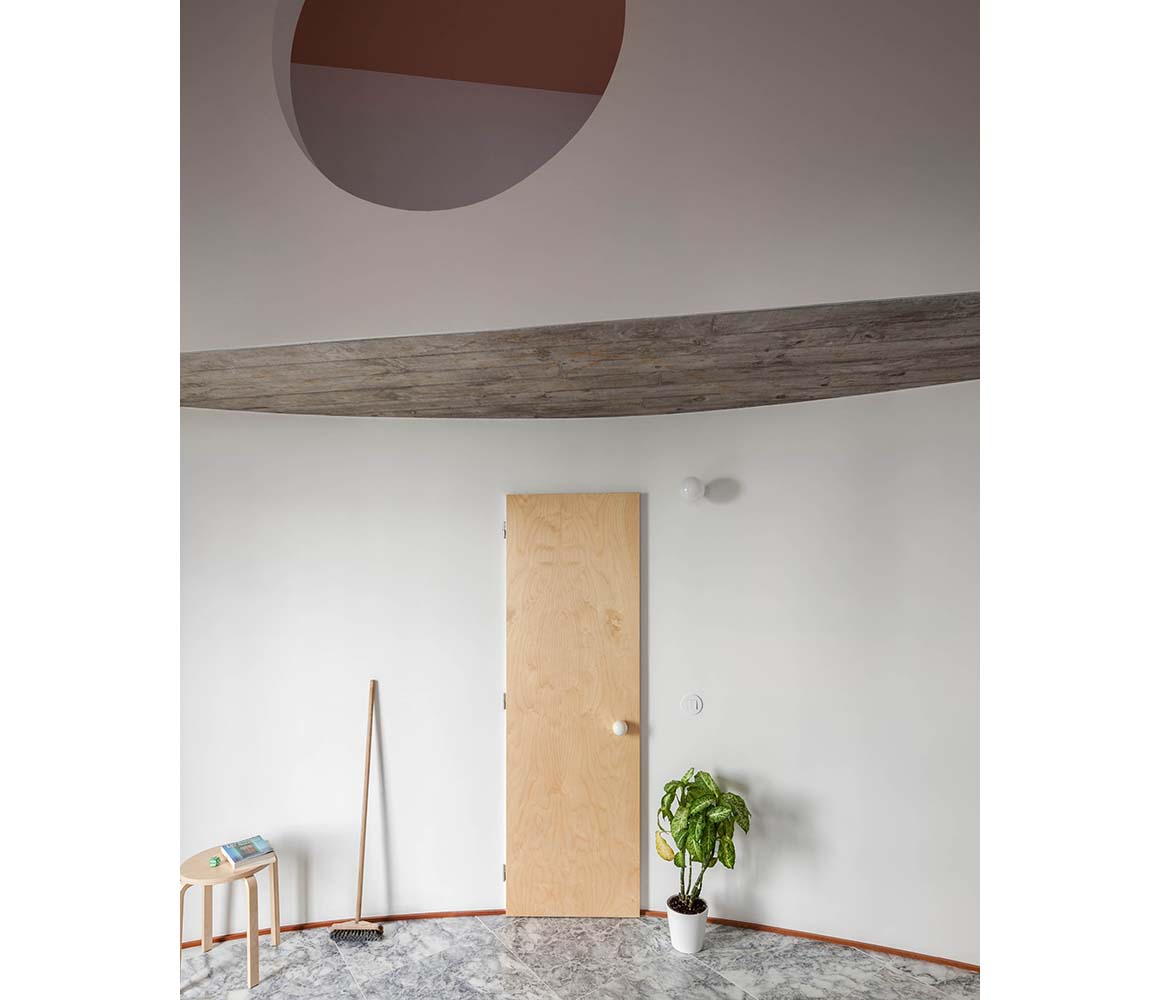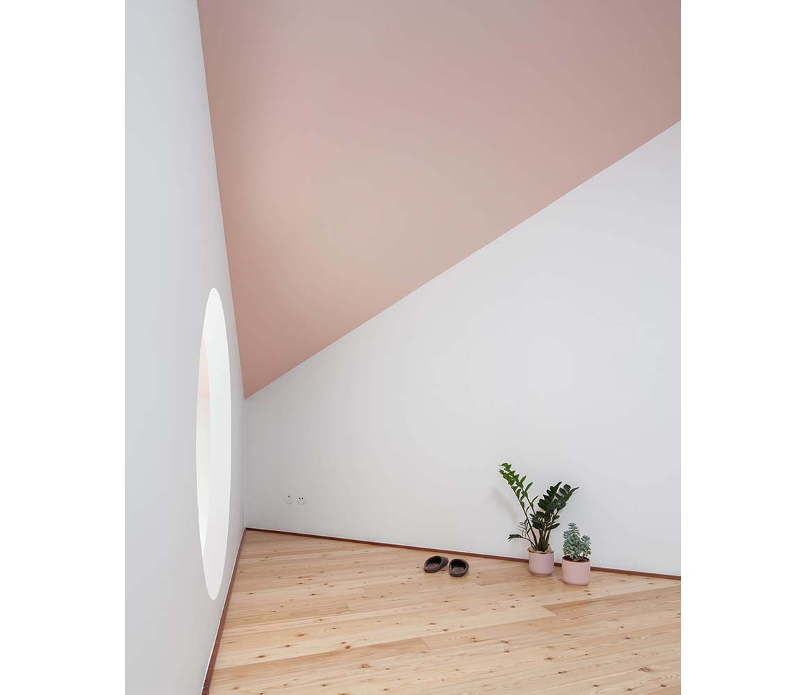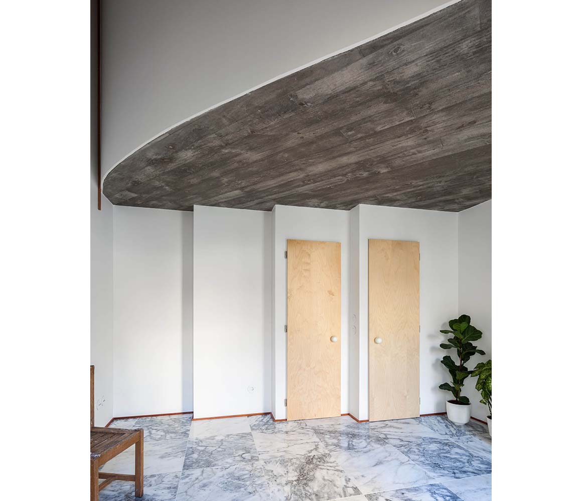 The materiality of the awkward interiors follows their complexity. Walls are deliberately left white, the horizontal slabs are abrupt concrete, the floors are made of polished blue marble and the tilted ceiling is painted in pink. Wooden doors, with exaggerated handles and hints of pink marble continue this game of surface experimentation.